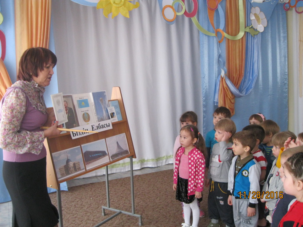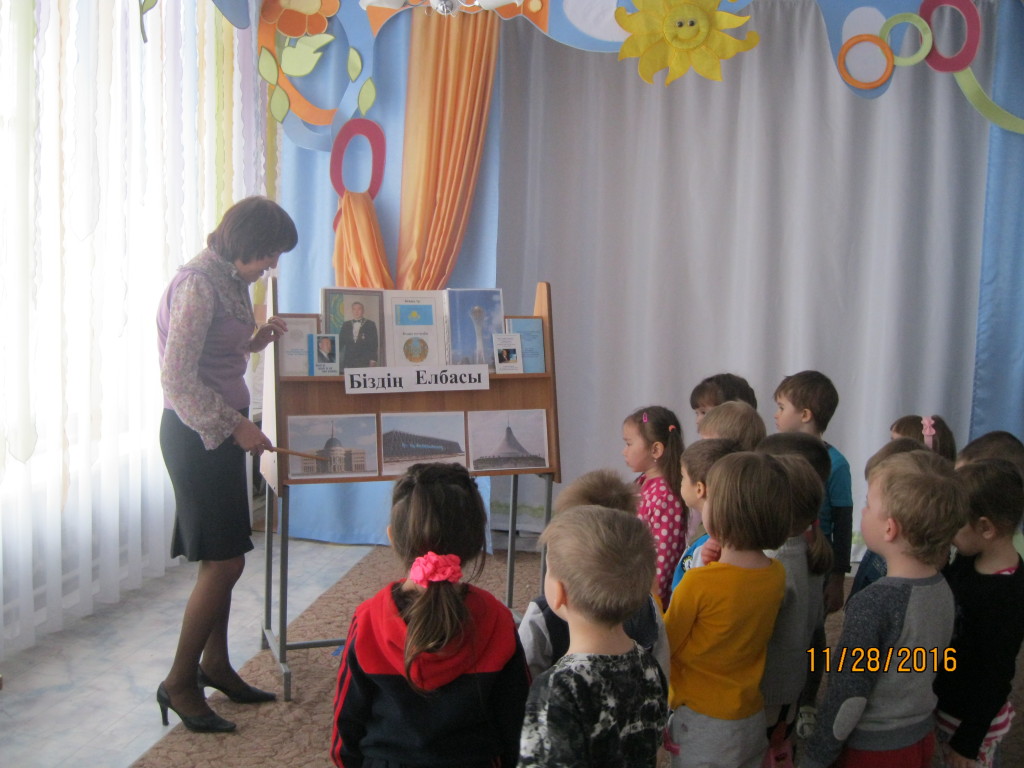 11-01211-013 2016 жылдың 28 қарашасында біздің балабақшада «Біздің Елбасы» әдебиет көрмесі өтті. Педагогтер балаларға біз көп ұлтты ел екені жайлы, барлық ұлт өкілдері елімізде тату – тәтті өмір сүріп жатқаны туралы айтты. Осы бірілікте, ынтымақтайықта өмір сүріп жатқан елді біздің тұңғыш президенті Нұрсұлтан Әбішұлы Назарбаев басқарады. Н.Ә. Назарбаевты біздің елде ғана емес бүкіл әлем біледі, құрметтейді. Балалар өте қызығушылықпен Елбасы туралы, рәміздер туралы әңгімеледі, тақпақ оқыды және «Егер мен Президенті болсам...» тақырыбына сұхбат құрды.