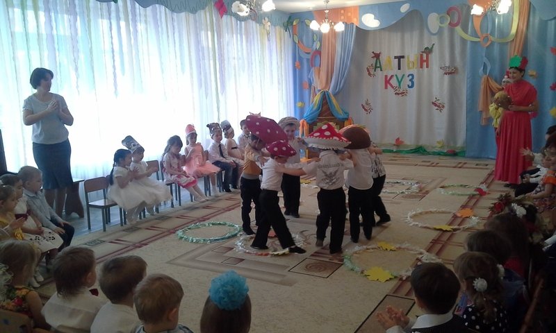 Біздің балабақшада 2015 жылдың 20, 21 қазанында барлық жас ерекшелігі топтарында «Алтын күз бізде қонақта» күзгі ойын – сауық өтті. Ән - күй залы алтын жапырақтар жамылып, нағыз күз патшалығына айналды. Қонаққа, балаларға сыйлықтарымен мәртебелі алтын күз келді. Кұзге құрмет ретінде балалар ән айтты, тақпақ оқып жұмбақтар шешті.