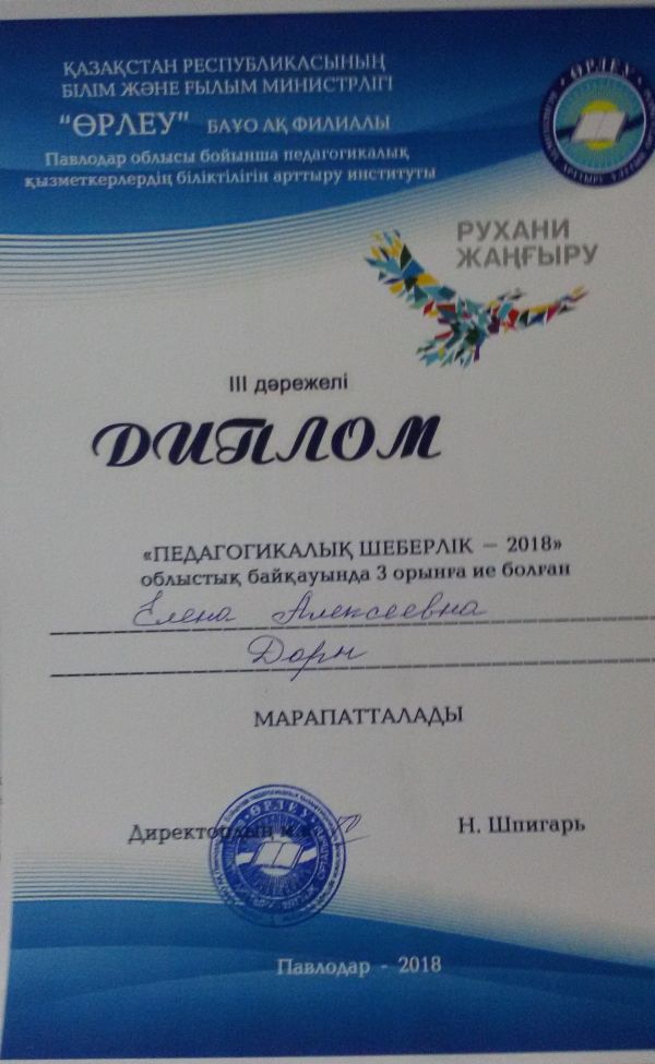 11 мая 2018 года филиалом АО "НЦПК "Өрлеу" ИПКПР по Павлодарской области" был организован конкурс "Педагогическое мастерство - 2018". С обобщением инновационного педагогического опыта в данном конкурсе приняла участие воспитатель нашего детского сада Дорн Елена Алексеевна. Она представила свою авторскую программу по вариативному компоненту "Экономическая азбука". По итогам конкурса Елена Алексеевна стала победителем (3 место) и награждена дипломом.