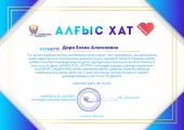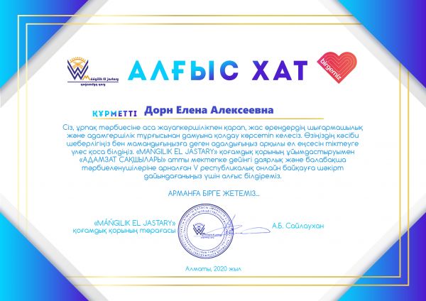 Біздің балабақшаның мектепалды даярлық тобы тәрбиеленушісі Луб Вероника "АДАМЗАТ САҚШЫЛАРЫ" республикалық сурет конкурсында 1 орын алды. "АДАМЗАТ САҚШЫЛАРЫ" пандемиямен күреске қатысқан барлық адамдарға арналған конкурсқа оны дайындаған тәрбиеші Дорн Елена Алексеевна, жас өрендердің шығармашылық және адамгершілік тұрғысынан дамуына қолдау көрсеткені үшін алғыс хатпен марапатталды