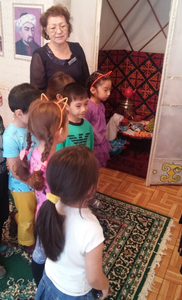 Преподаватель казахского языка Жунусова Ж.К. провела с детьми подготовительной группы "А" экскурсию по кабинету, в ходе которой дети рассматривали предметы быта, иллюстрации казахской национальной одежды.