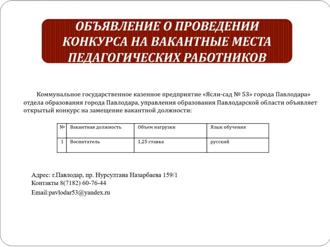 КГКП«Ясли – сад 53  города Павлодара» отдела образования города Павлодара, управления образования Павлодарской области объявляет конкурс на вакантные места.