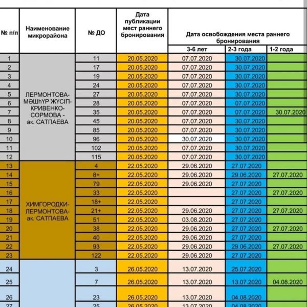 График публикации мест раннего бронирования в ДОУ г.Павлодара
