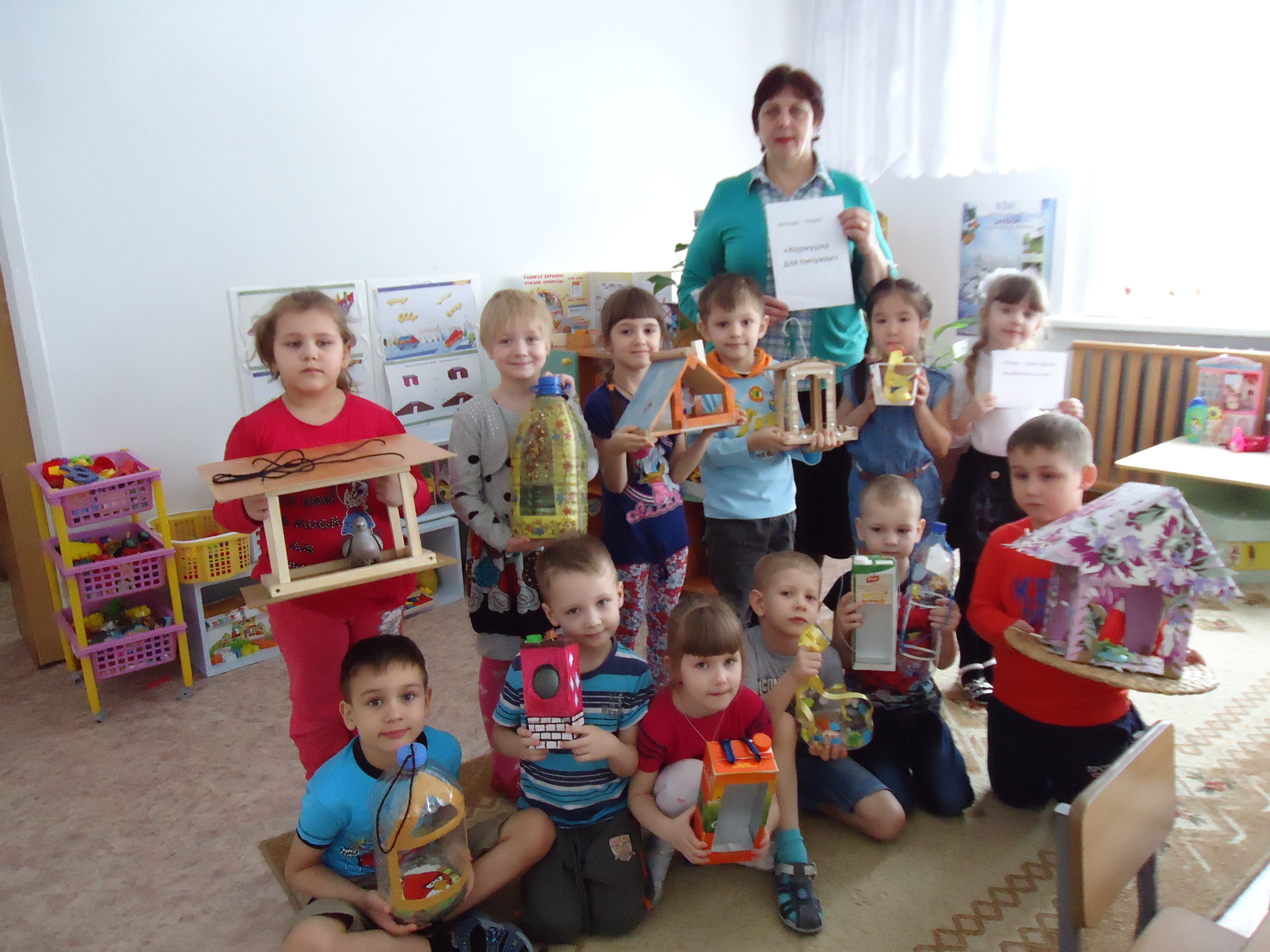 В старшей группе «Б» под руководством воспитателя Тихоновой Г.Д. была проведена акция «Поможем пернатым друзьям». Проводилась предварительная работа: занятия по экологии «Зимующие и перелетные птицы», аппликации «Птицы на ветке», лепке «Карлыгаш кормит птиц», коллективное рисование «Птицы на кормушке», художественной литературе: чтение рассказа Л.Толстого: «Птичка», беседа «Жизнь птиц зимой», дидактические и подвижные игры. Ребята узнали много нового и интересного о зимующих птицах. Родители приняли активное участие в акции. Вместе с детьми они изготовили красивые и прочные кормушки из бросового материала: (остатков фанеры, дерева, ламината, пластиковых бутылок, пустых пакетов, и других материалов). В помощь родителям был предложена интересная беседа: « Как сделать кормушку?», консультации: «Правила подкормки птиц», «Корма для птиц». Кормушки нашим пернатым должны понравиться. Совместное творчество детей и родителей. Красиво? Правда?