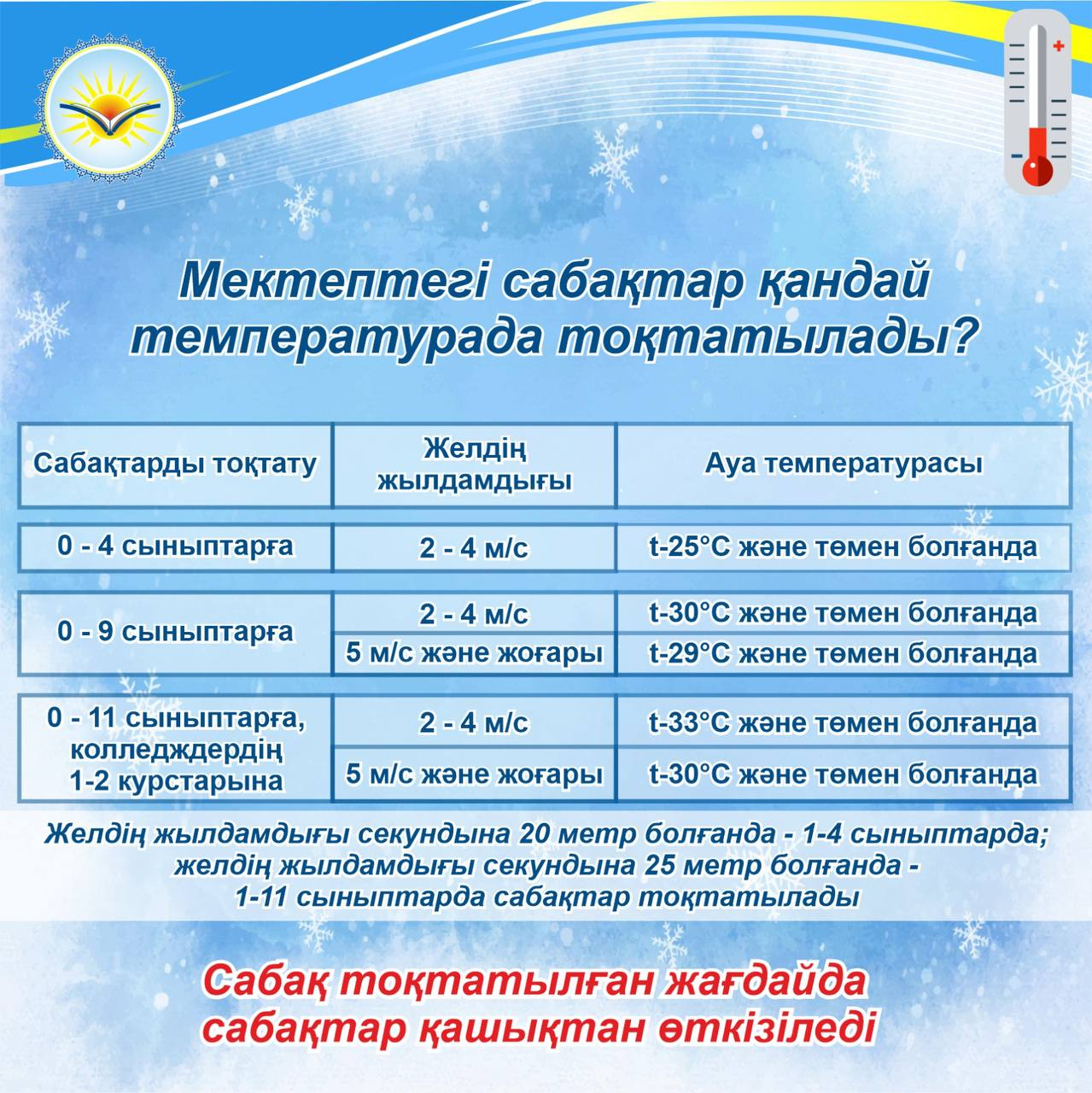 Қысқы кезеңдегі ауа-райының қолайсыз жағдайларына байланысты сабақтарды тоқтату параметрлері