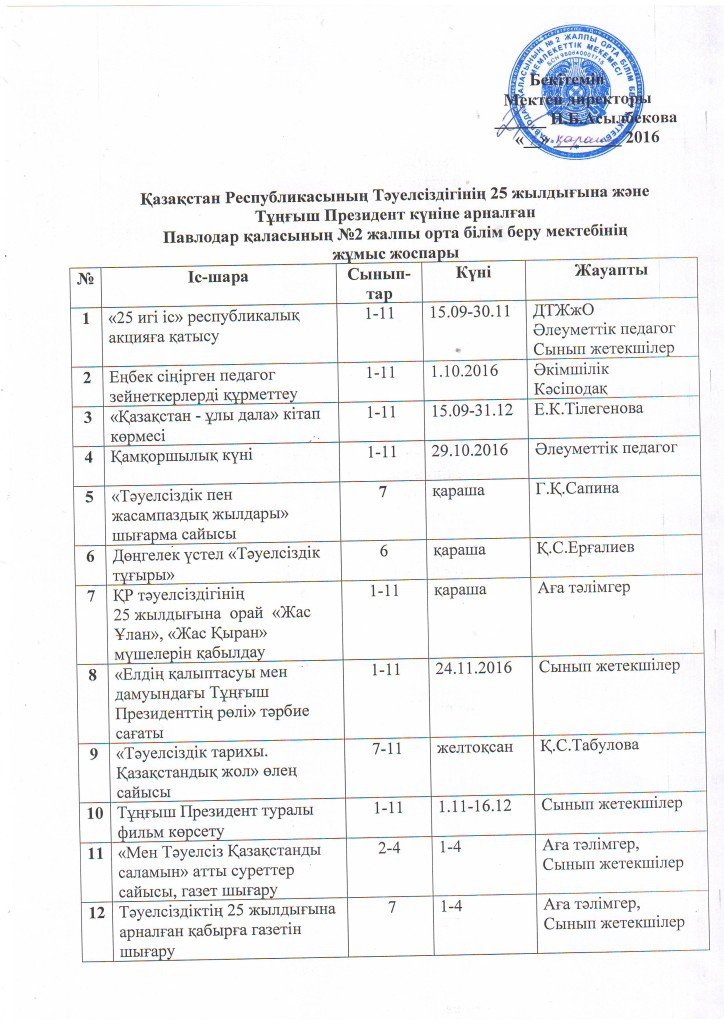 СОШ № 2 25 жыл тәуелсіздіктік күніне арналған іс-шаралардың жоспары