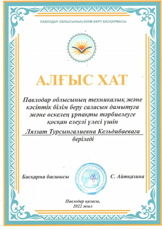 жетекшісі Кельдыбаева Ляззат Турсынгалиқызы
