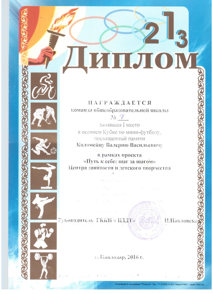 В спортивной секции занимаются 15 человек, занятия проходят в СОСШПА № 7 в большом спортивном зале. Данный вид спорта развивает выносливость, координацию, умение владеть мячом. Это командная спортивная игра на специальной площадке, цель которой забить мяч ногами или другой частью тела (кроме рук) в ворота соперника. Ученики в ходе игры, определив круг защиты и нападения используя технико- тактические приёмы, стараются забить в ворота противника как можно больше мячей. Занятия проходят вторник, пятница с 14.30. часов.