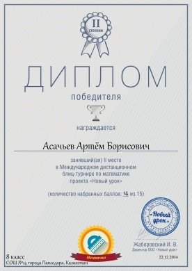 Диплом победителя международной дистанционном блиц-турнире по математике Асачьев Артём Диплом победителя международного дистанционного блиц-турнира по математике Асачьев Артём