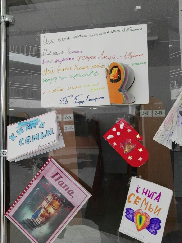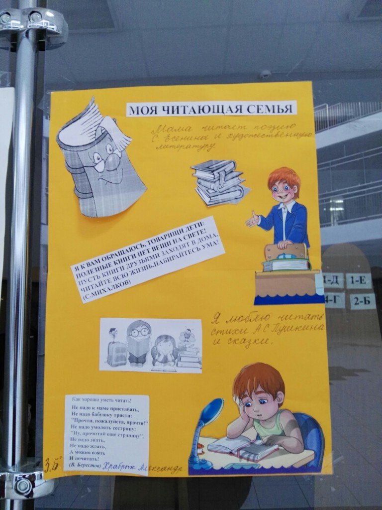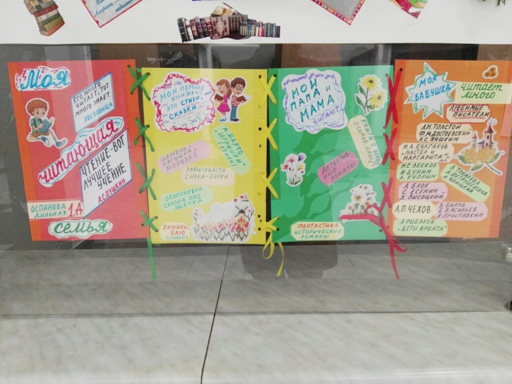 С 14 ноября по 17 ноября 2016 проходила акция «Читающая семья» приуроченная к 25 летию Независимости РК с участием родителей 1-10 классов. Приняли самое активное участие классные коллективы 5 а-9 работ, 4 в -7 работ, 1д- 2 работы, 3 б-6 работ, 7в – 2 работы, 5 д – 1, 1 б -1. Были представлены книжки раскладушки, фото и рисунки читающих членов семьи. Самые яркие работы у учащихся Еремина А-4 в класс, Тюмебаева А-1 б, Оспановой Д-1 Д , 5 д – Ломоносова А, Табар Ж-4 в кл. Выражаем благодарность родителям участникам акции «Читающая семья».