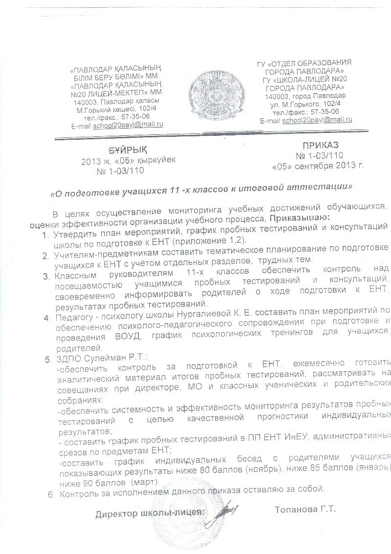 | Павлодар қаласының №20 лицей-мектебінің 2013-2014 оқу жылының ҰБТ-ға дайындалуы мен өткізуін ұйымдастыру жоспары. Павлодар қаласының №20 лицей-мектебінің 2013-2014 оқу жылының ҰБТ-ға дайындалуы мен өткізуін ұйымдастыру жоспары | Скачать |