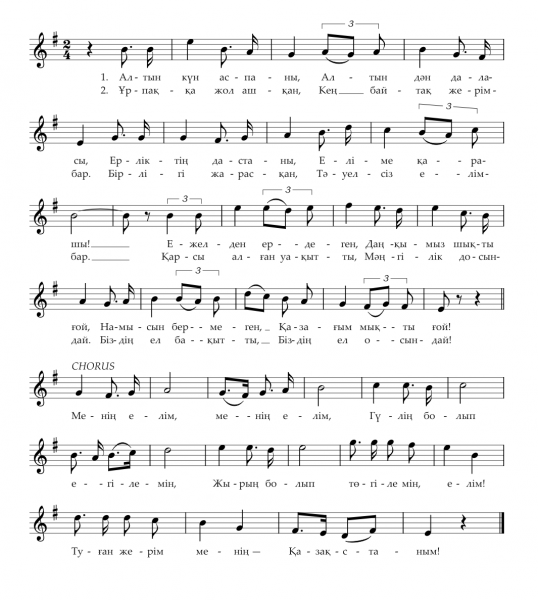 Гимн – это один из главных символом государства. Сам термин «гимн» происходит от греческого слова «gimneo» и означает «торжественная песня». Гимн выступает в качестве важной звуковой символики, имеющей ключевое значение для эффективной социально-политической консолидации и этнокультурной идентификации граждан страны. В истории независимого Казахстана государственный гимн страны утверждался дважды – в 1992 и в 2006 годах. После обретения республикой государственного суверенитета в 1992 году был объявлен конкурс на музыку и текст гимна Казахстана. По итогам конкурса было принято решение сохранить музыкальную редакцию гимна Казахской ССР. Таким образом, авторами музыки первого казахстанского гимна стали Мукан Тулебаев, Евгений Брусиловский и Латиф Хамиди. В конкурсе на лучший текст также победил авторский коллектив, представленный известными поэтами: Музафаром Алимбаевым, Кадыром Мырзалиевым, Туманбаем Молдагалиевым и поэтессой Жадырой Дарибаевой. В целях популяризации звуковой символики страны в 2006 году был принят новый государственный гимн. Его основой стала популярная в народе патриотическая песня «Менiң Қазақстаным». Она была написана в 1956 году Шамши Калдаяковым на стихи Жумекена Нажимеденова. Для придания песне высокого статуса государственного гимна и более торжественного звучания Президент Казахстана Нурсултан Назарбаев доработал первоначальный текст. Парламент Казахстана на совместном заседании палат 6 января 2006 года внес соответствующие поправки в Указ «О государственных символах» и утвердил новый государственный гимн страны. 5472c53519dbe   Сөзін жазғандар: Жұмекен Нәжімеденов, Нұрсұлтан Назарбаев Әнін жазған: Шәмші Қалдаяқов Алтын күн аспаны, Алтын дән даласы, Ерліктің дастаны, Еліме қарашы! Ежелден ер деген, Даңқымыз шықты ғой. Намысын бермеген, Қазағым мықты ғой! Қайырмасы: Менің елім, менің елім, Гүлің болып егілемін, Жырың болып төгілемін, елім! Туған жерім менің - Қазақстаным! Ұрпаққа жол ашқан, Кең байтақ жерім бар. Бірлігі жарасқан, Тәуелсіз елім бар. Қарсы алған уақытты, Мәңгілік досындай, Біздің ел бақытты, Біздің ел осындай! Қайырмасы: Менің елім, менің елім, Гүлің болып егілемін, Жырың болып төгілемін, елім! Туған жерім менің - Қазақстаным!   https://www.youtube.com/watch?v=H2_e4EhHUZ8