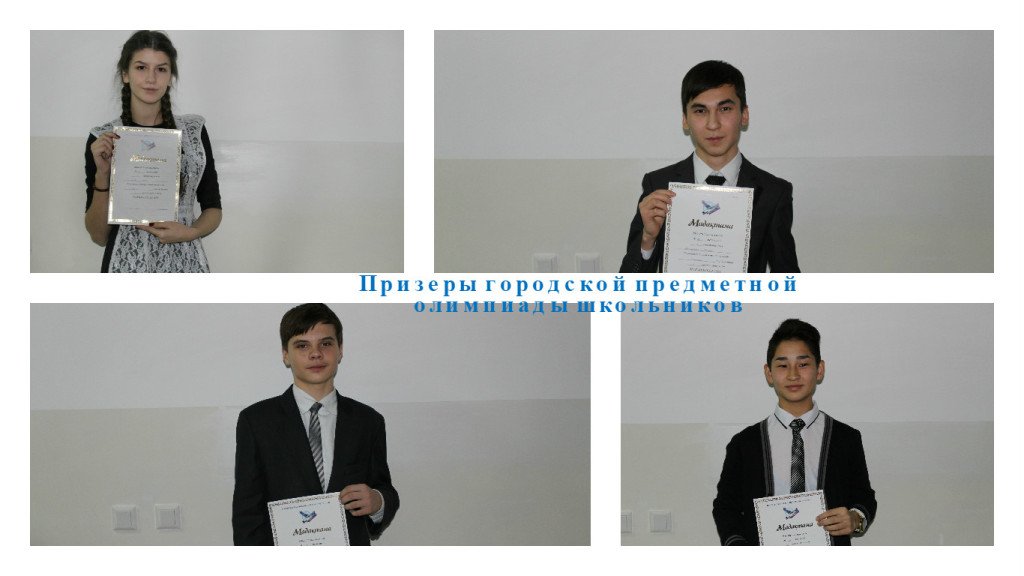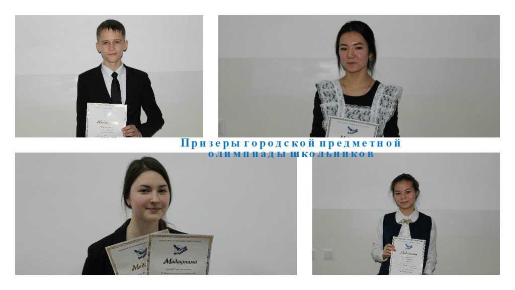 ИТОГИ ГОРОДСКОЙ ПРЕДМЕТНОЙ ОЛИМПИАДЫ ШКОЛЬНИКОВ На основании плана работы отдела образования 8 - 9 декабря 2016 года состоялась городская предметная олимпиада школьников по 15-ти общеобразовательным предметам на казахском и русском языках. Участие школьников в городской олимпиаде - ступенька в формировании интеллектуальной культуры и обретении опыта. В олимпиаде приняли участие 26 учащихся. Призерами олимпиады по казахскому языку стали учащиеся 8б класса Маканов Ансат т ученица 10б класса Бейбитова Дарига, по английскому языку ученица 7д класса Иванова Ангелина, она также отмечена дипломом «Юное дарование», по русскому языку ученица 10б класса Спатилова Жанна, по основам права ученик 10б класса Бегалко Илья и ученица 10а класса Кравцова Дарья, по физике ученик 8в класса Созин Илья и ученик 9в класса Сеннов Борис, по географии ученик 8в класса Даниярбеков Дархан, 8а класса Кадырбаев Нурсултан и ученик 10а класса Курманов Асанали, по математике ученица 8в класса Калинкина Ариана. Бегалко Илья и Курманов Асанали представят школу в январе 2017 года в областном туре школьной предметной олимпиады. Поздравляем и желаем дальнейших творческих успехов!!!
