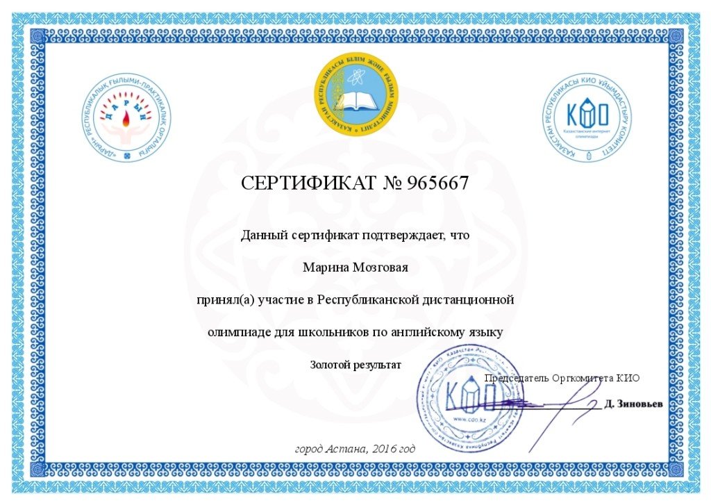 Цель дистанционных олимпиад - выявление и развитие творческих способностей участников. В олимпиадах могут участвовать школьники с любым уровнем подготовки. Для выполнения заданий требуется проявить не только знание предмета, но и индивидуальность, уникальность, самобытность.По итогам Казахстанской Интернет-олимпиады по английскому языку дипломом I степени отмечена ученица 8 класса Мозговая Марина, дипломом III степени ученица 6 класса Крачковская Анастасия. 21 учащийся школы приняли участие в КИО по английскому языку, из них 7 учащихся успешно выполнили задания второго тура. Отдельные слова благодарности за достигнутые успехи учащихся хочется выразить учителю английского языка Смаиловой Жанат Капсаттаровне!!! Желаем дальнейших творческих успехов и новых побед!!!