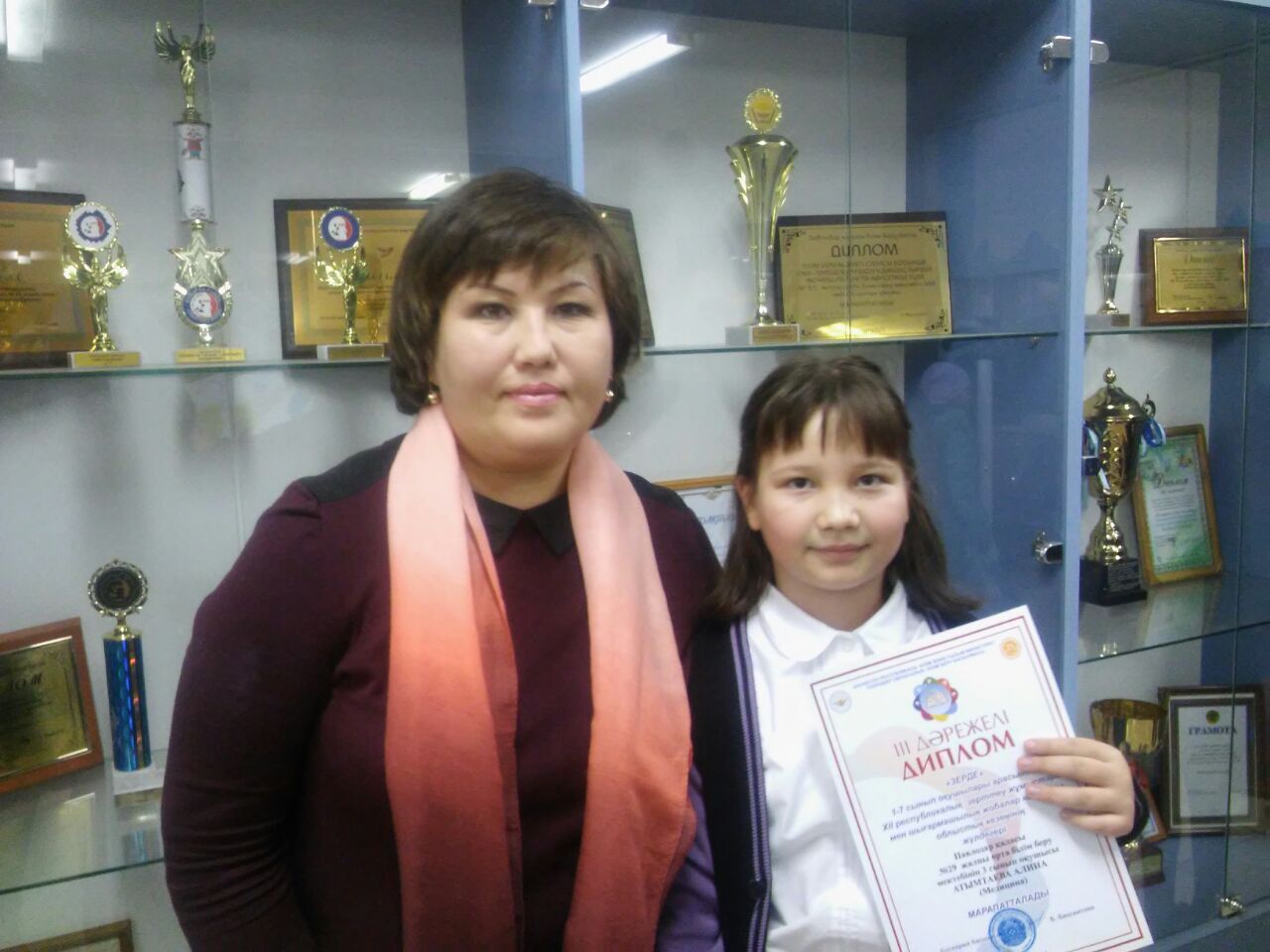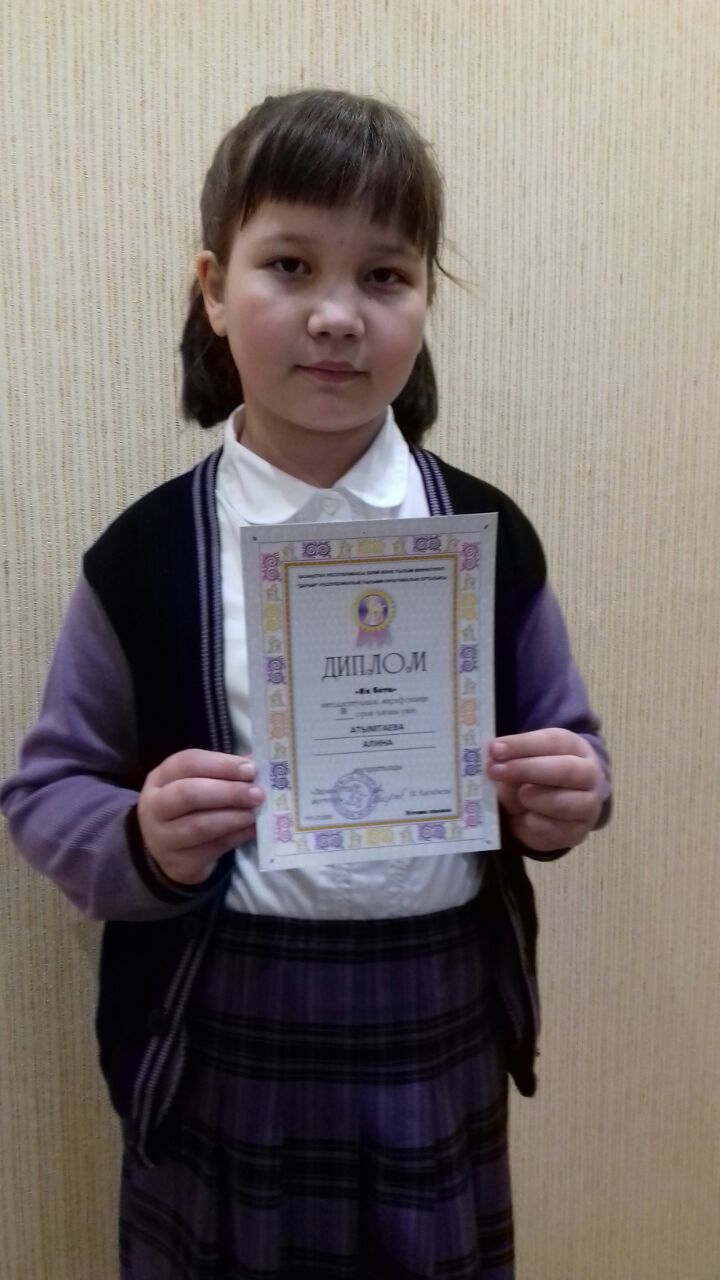 | 2 | Атымтаева Алина | 3е | 1 место | Исмаилова Б.Е. |