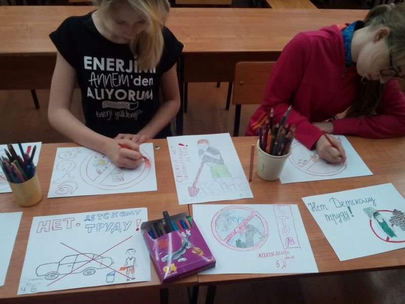 «Қазақстан балалары – Нұрлы болашақ», "12 күн балалардың еңбегін пайдалануға қарсы" Ұлттық ақпараттық Кампаниясы аясында, бейіндік лагердің "Изонить" отрядының балалары "Біз балалардың еңбегін пайдалануға қарсымыз" суреттер көрмесін ұйымдастырды. Шығармашылық жұмыстар акварель бояуларымен және түрлі-түсті қарандаштармен орындалды. Суреттер жалпы көрсетілімге мектептің ақпараттық стендіне орналастырылды.