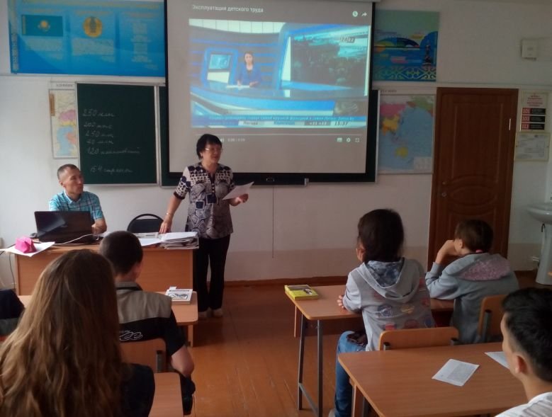 «Қазақстан балалары – Нұрлы болашақ» акциясы, «Балалардың еңбегін пайдалануға қарсы 12 күн"» Ұлттық ақрараттық Кампаниясы аясындағы іс-шаралар жалғасуда. Бейіндік лагердің жоғарғы сынып оқушылары арасында "Балалардың еңбегін пайдалану" домалақ үстел ұйымдастырылып, өткізілді. Тарих мұғалімдері Салимов Ж.С., Ибраева М.К. бүкіл әлем бойынша балалардың еңбегін заңсыз пайдаланудың қылмыстық фактілері туралы мультимедиялық презентацияларды және бейнероликтерді дайындап, көрсетті. Балалар жиналғандарға балалардың еңбегін пайдаланудың заманауи әдістері мен негізгі түрлері туралы айтып берді. домалақ үстел қатысушылары мықты азаматтық позиция сезімімен балаларға қатысты зұлымдық пен зорлыққа төзбеушілікті көрсетті.