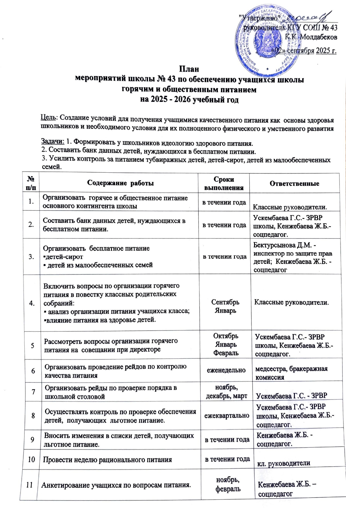 Оқушыларды ыстық тамақпен қамтамасыз ету бойынша жоспар