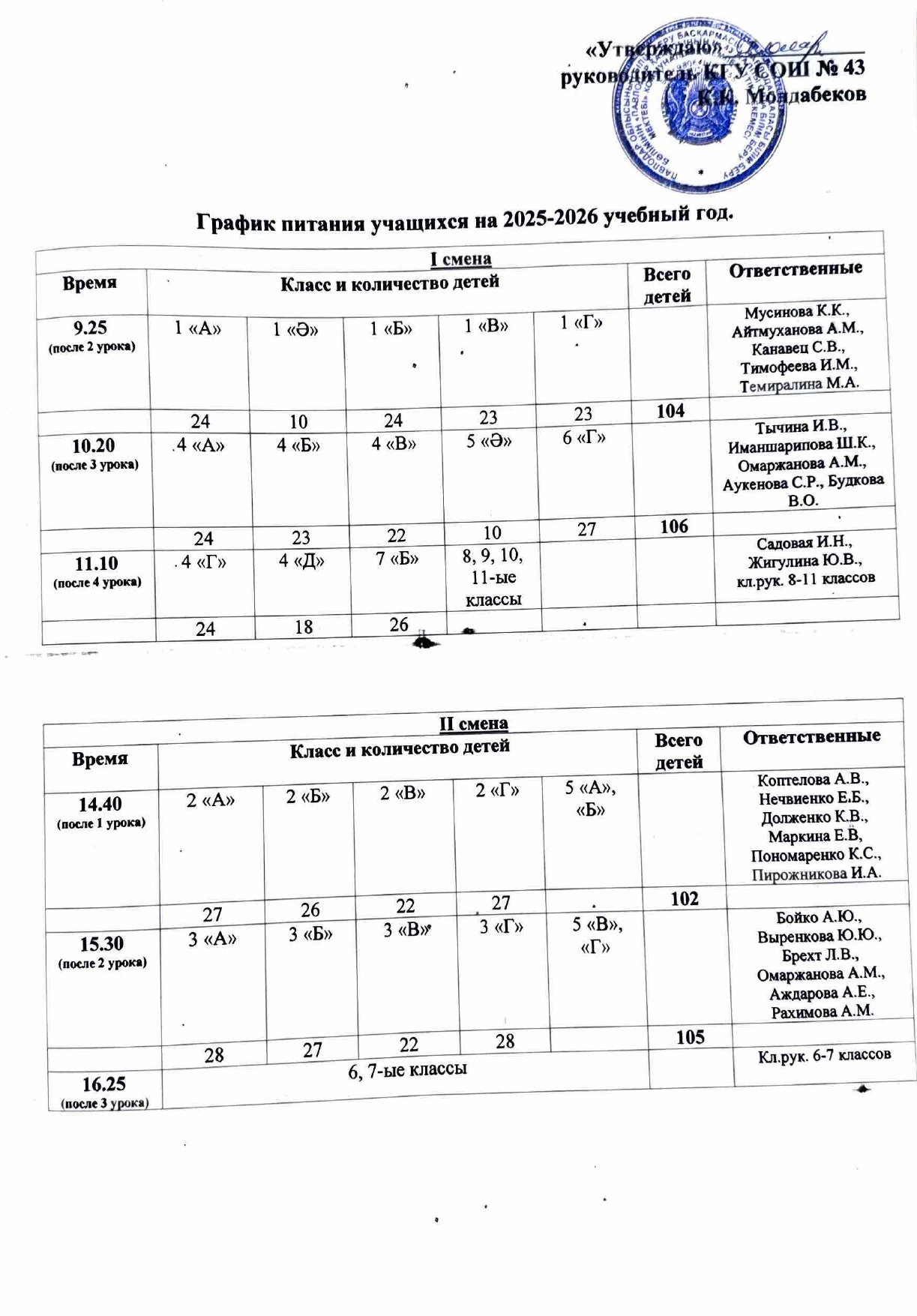 2025-2026 оқу жылына оқушылардың тамақтану кестесі
