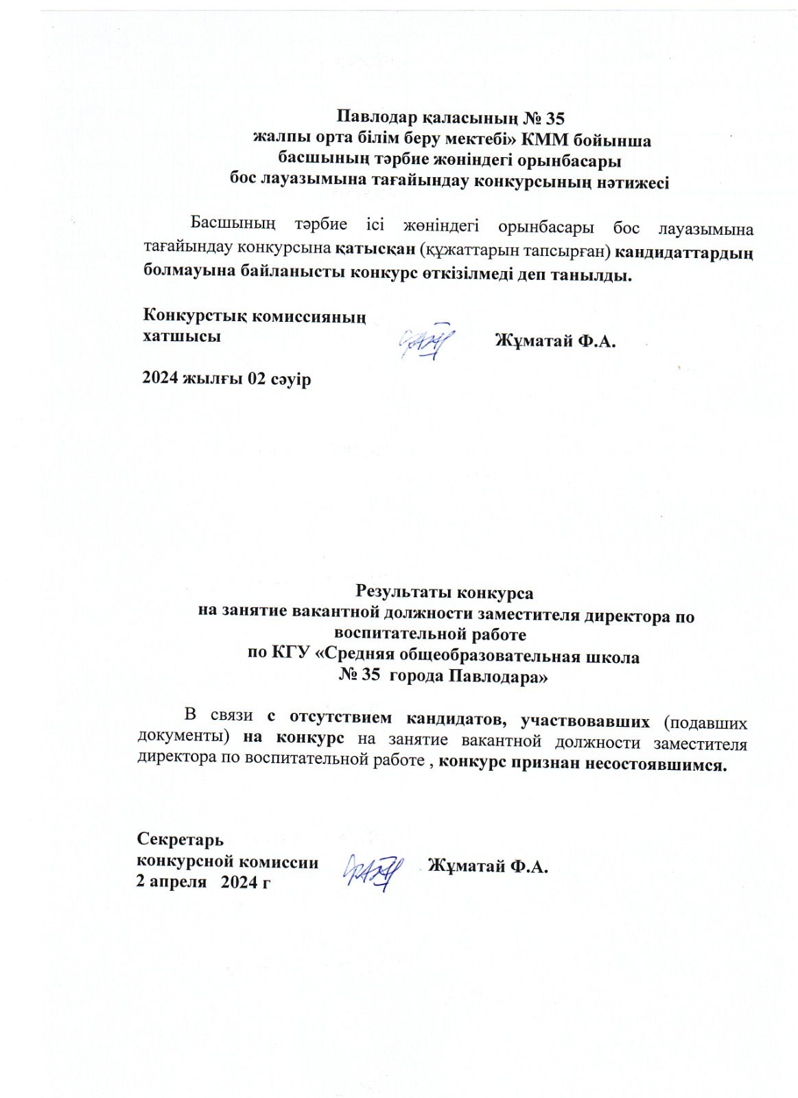 Павлодар қаласының № 35 жалпы орта білім беру мектебі» КММ бойынша басшының тәрбие жөніндегі орынбасары бос лауазымына тағайындау конкурсының нәтижесі | көшіріп алу |