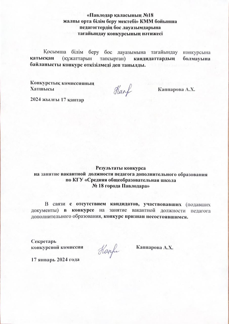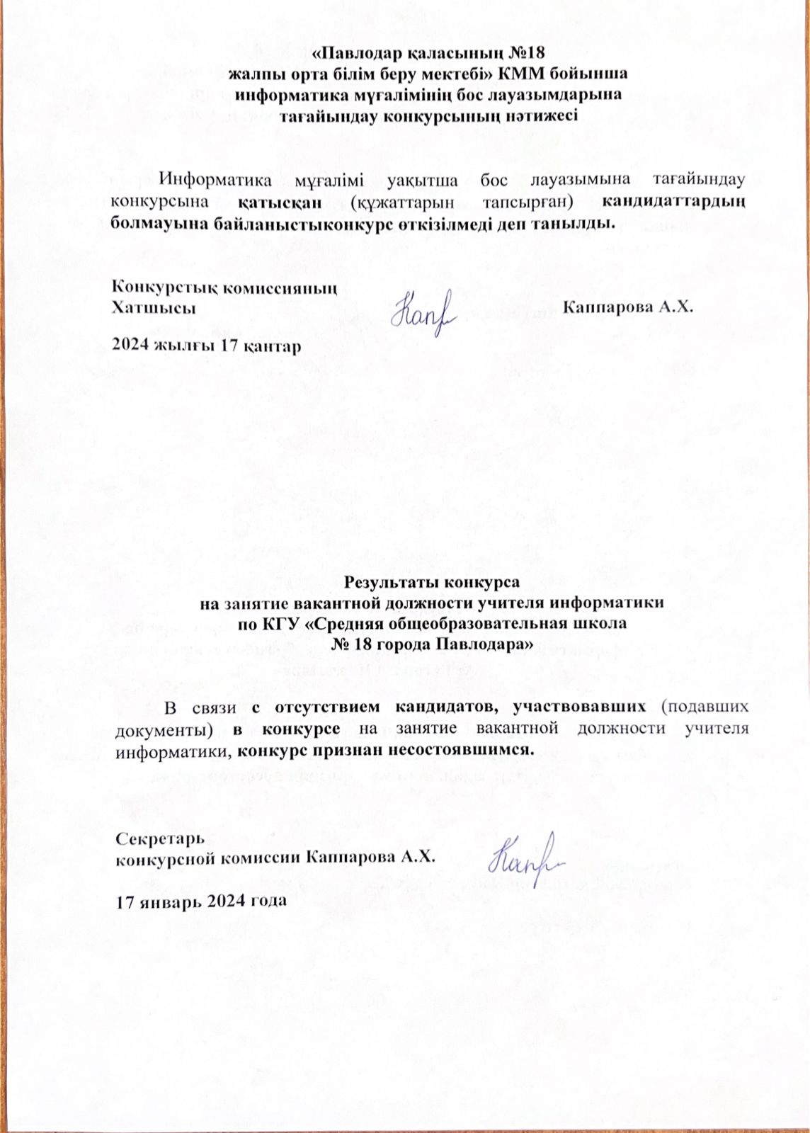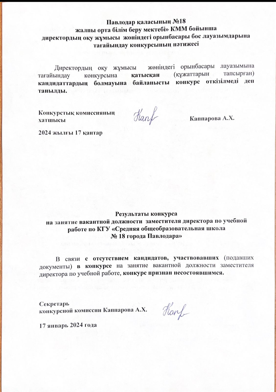 Павлодар қаласының № 18 жалпы білім беретін орта мектебі " КММ директордың оқу жұмысы жөніндегі орынбасары бос лауазымына конкурс жариялайды | көшіріп алу қарау |