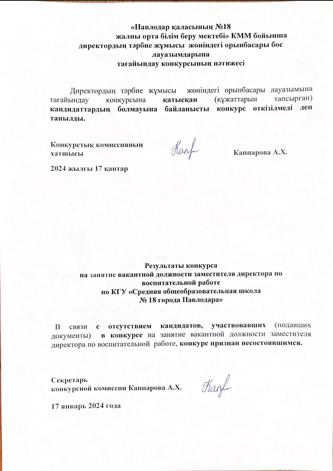 КГУ «Средняя общеобразовательная школа № 18 города Павлодара» объявляет конкурс на вакантную должность заместителя директора по воспитательной работе | көшіріп алу қарау |