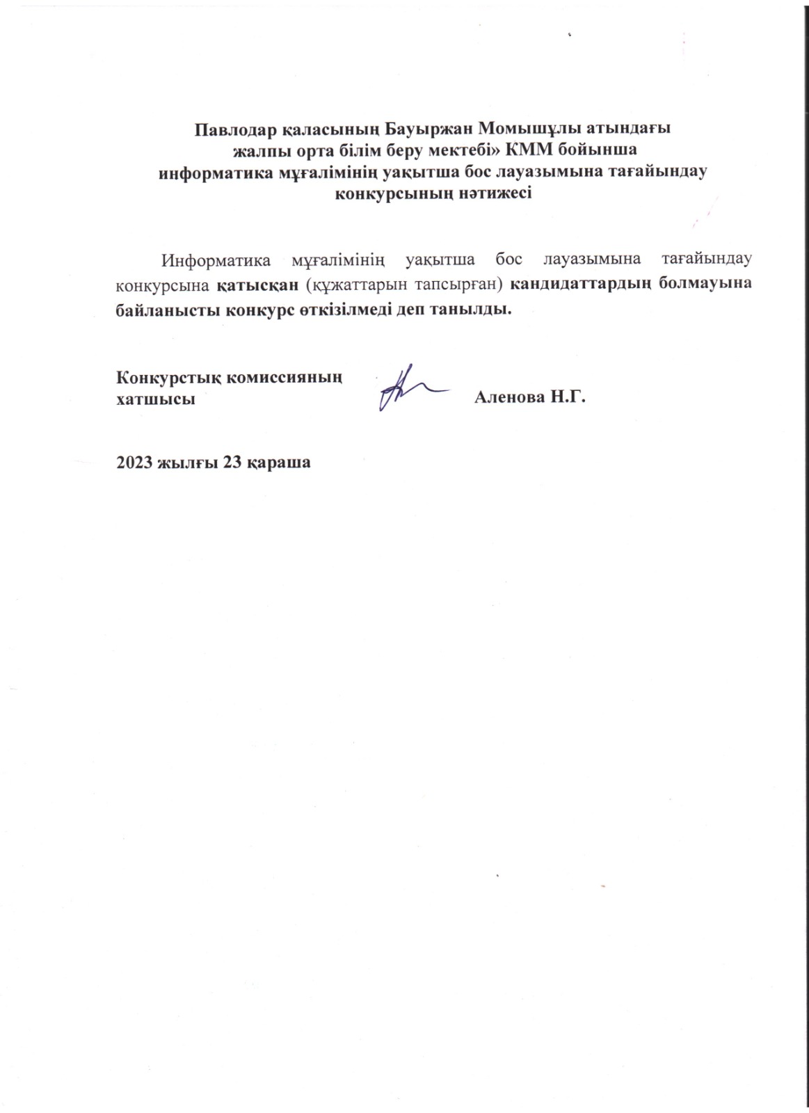 «Павлодар қаласының Бауыржан Момышұлы атындағы жалпы орта білім беру мектебі» КММ бойынша музыка жетекшісі бос лауазымына тағайындау конкурсының нәтижесі. | көшіріп алу |