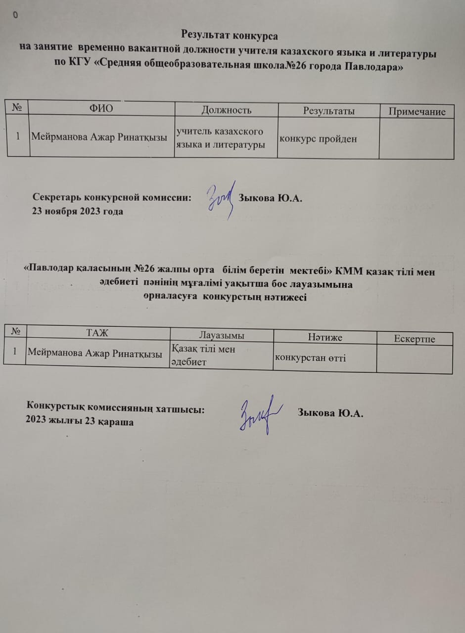 «Павлодар қаласының № 41 денешынықтыру – сауықтыру бағытындағы жалпы орта білім беру бейіндік мектебі» КММ бейіндік оқыту жөніндегі орынбасары бос лауазымына тағайындау конкурсының нәтижесі | көшіріп алу қарау |