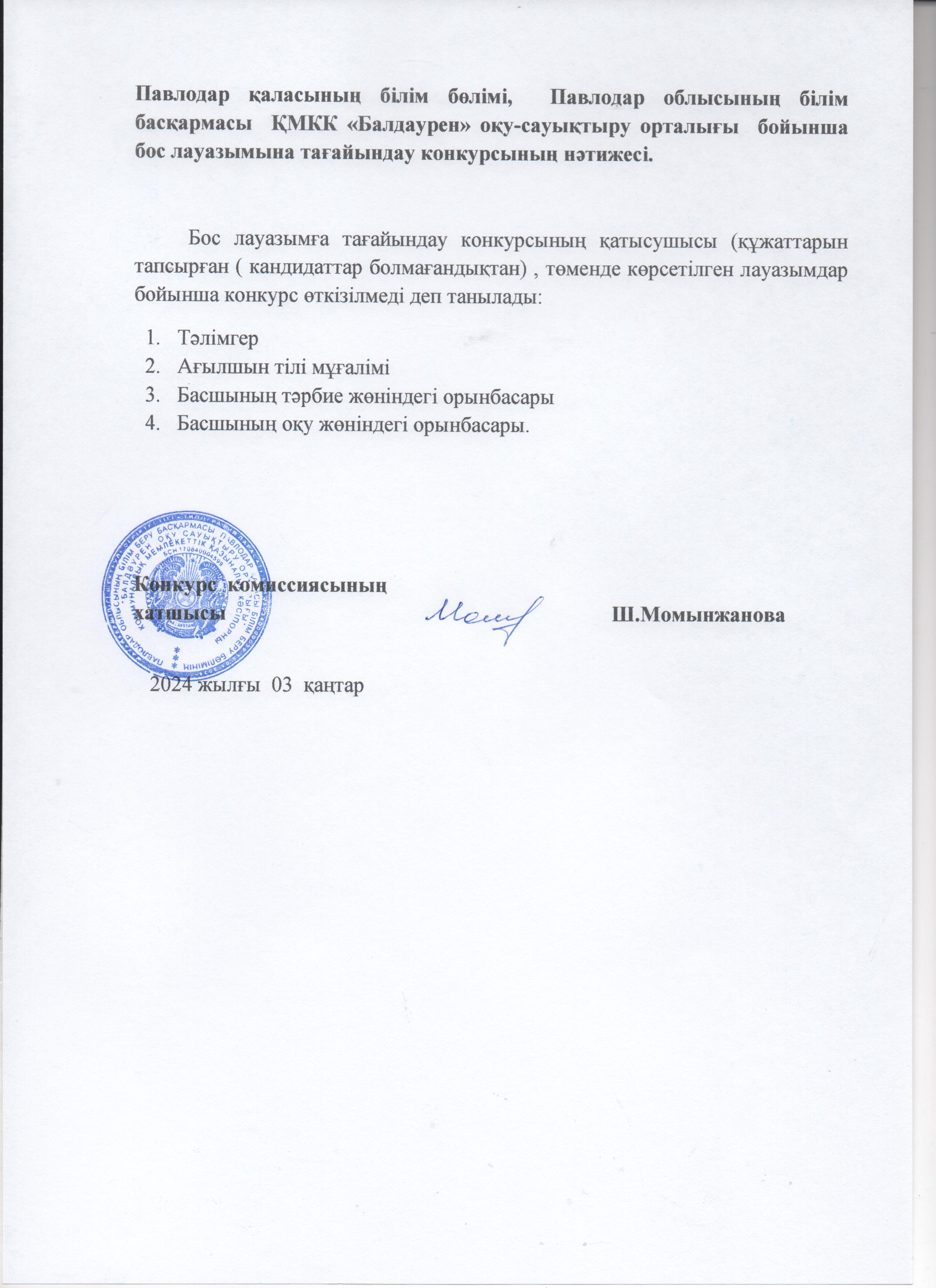 Павлодар қаласының білім бөлімі, Павлодар облысының білім басқармасы ҚМКК «Балдаурен» оқу-сауықтыру орталығы бойынша бос лауазымына тағайындау конкурсының нәтижесі. | Скачать |