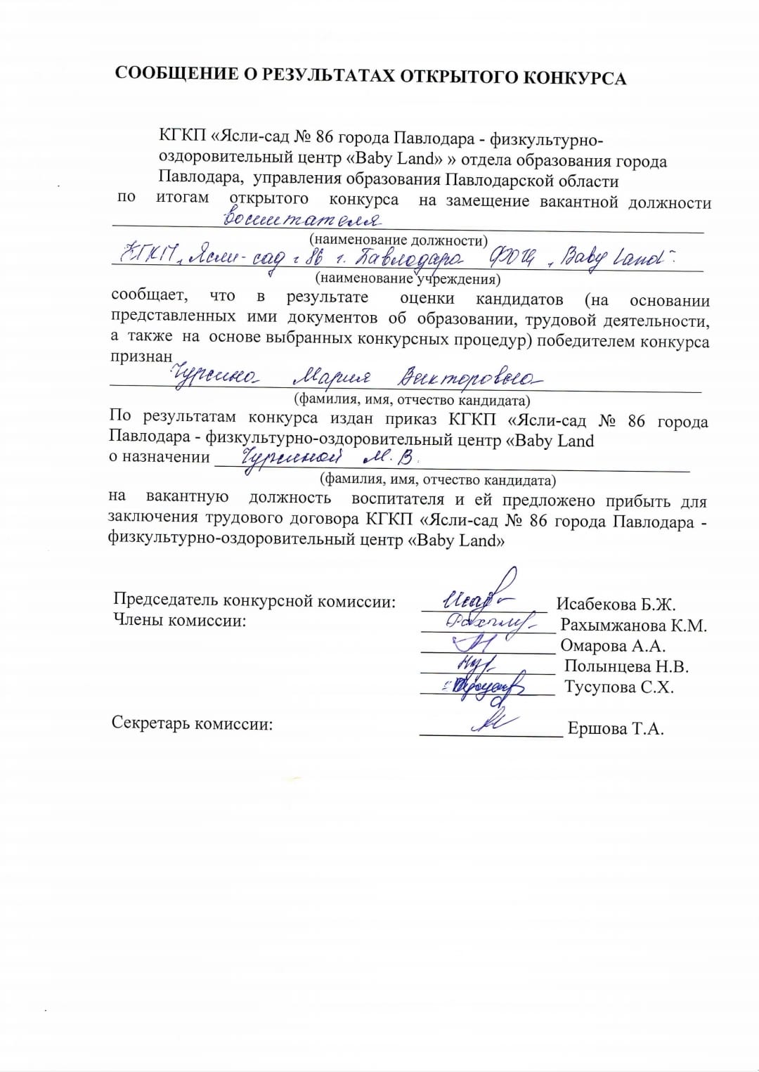 Ашық конкурстың нәтижелері туралы хабарлама | Скачать |