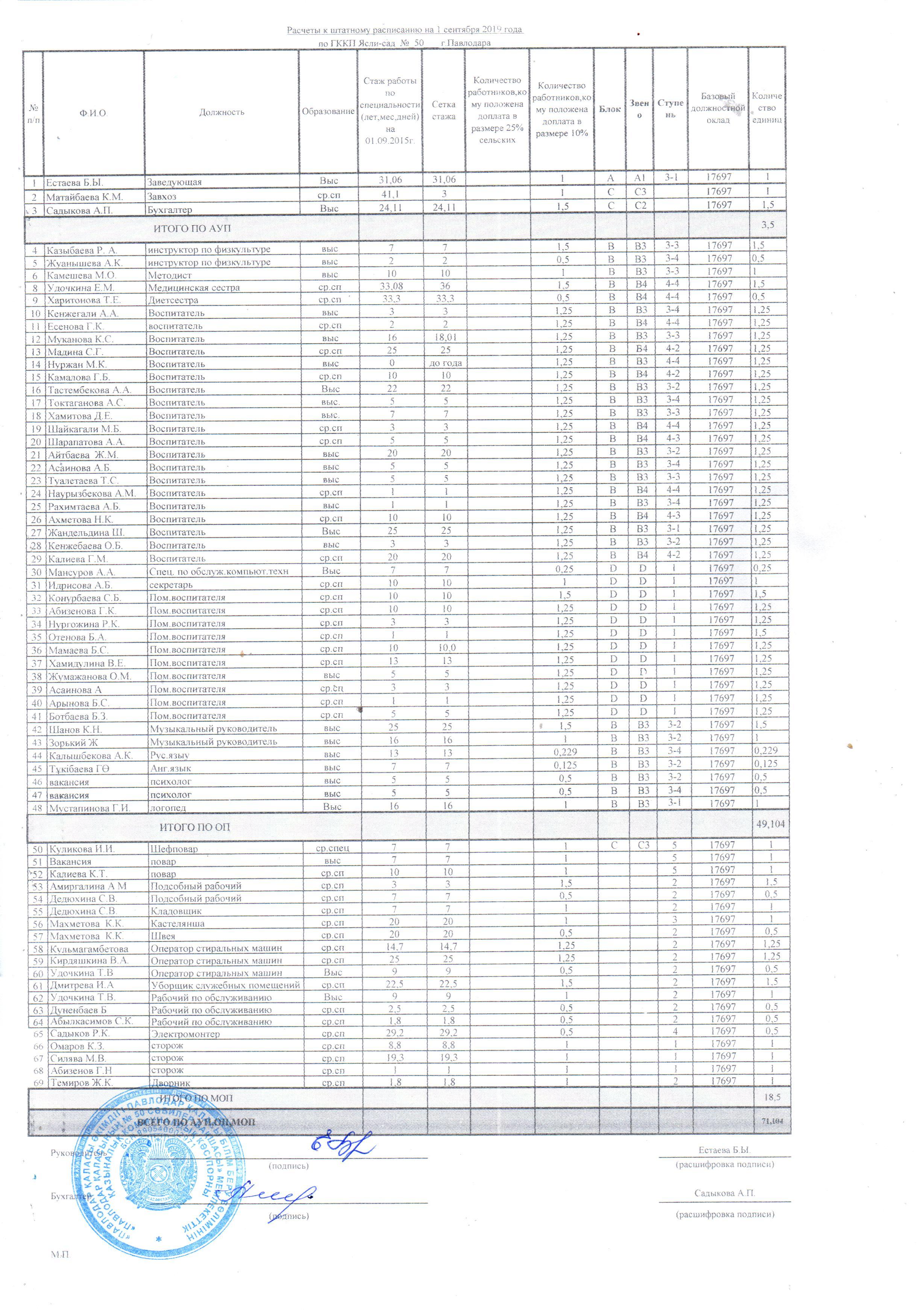 Расчеты к штатному расписанию на 01.09.2019 год | көшіріп алу |