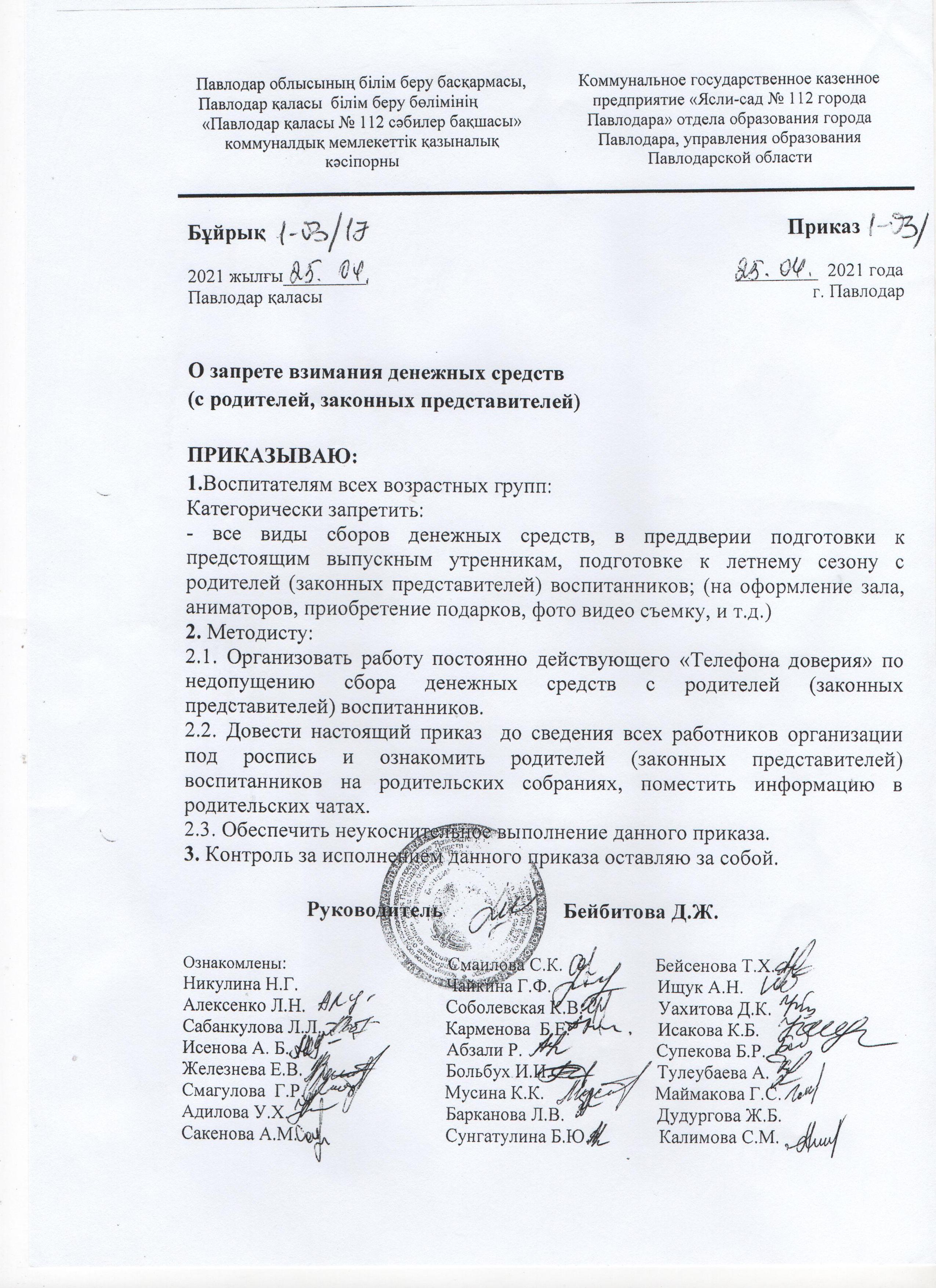 Приказ о запрете сбора денежных средств в детскому саду