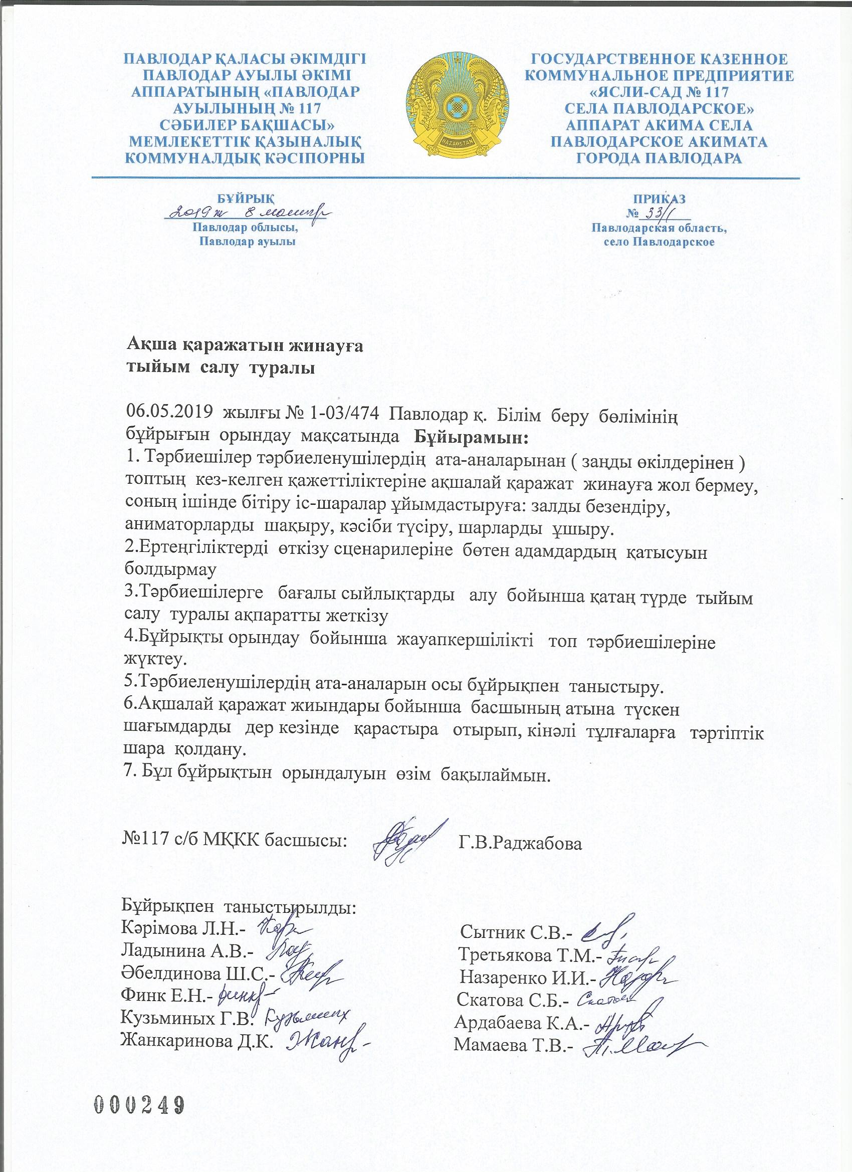 Приказ о запрете сбора денежных средств (на каз. яз)