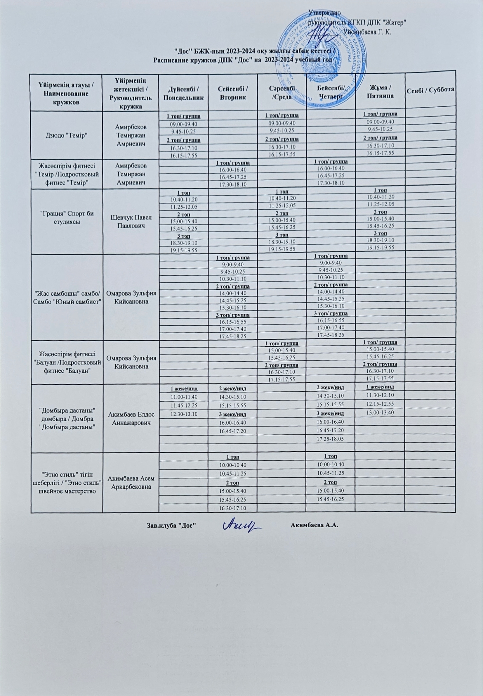 Расписание кружковой работы подразделения ДПК "Бирлик"
