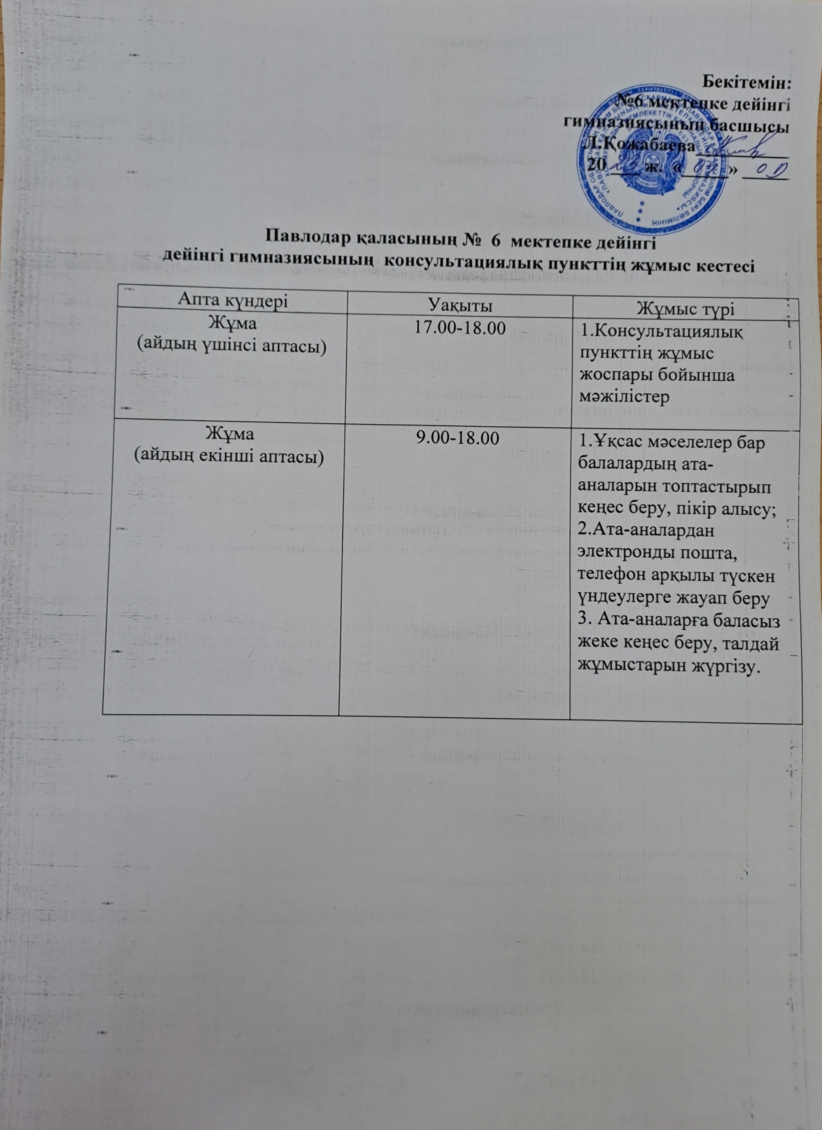 - Павлодар қаласының № 6 мектепке дейінгі гимназиясының консультациялық пункттің жұмыс кестесі
