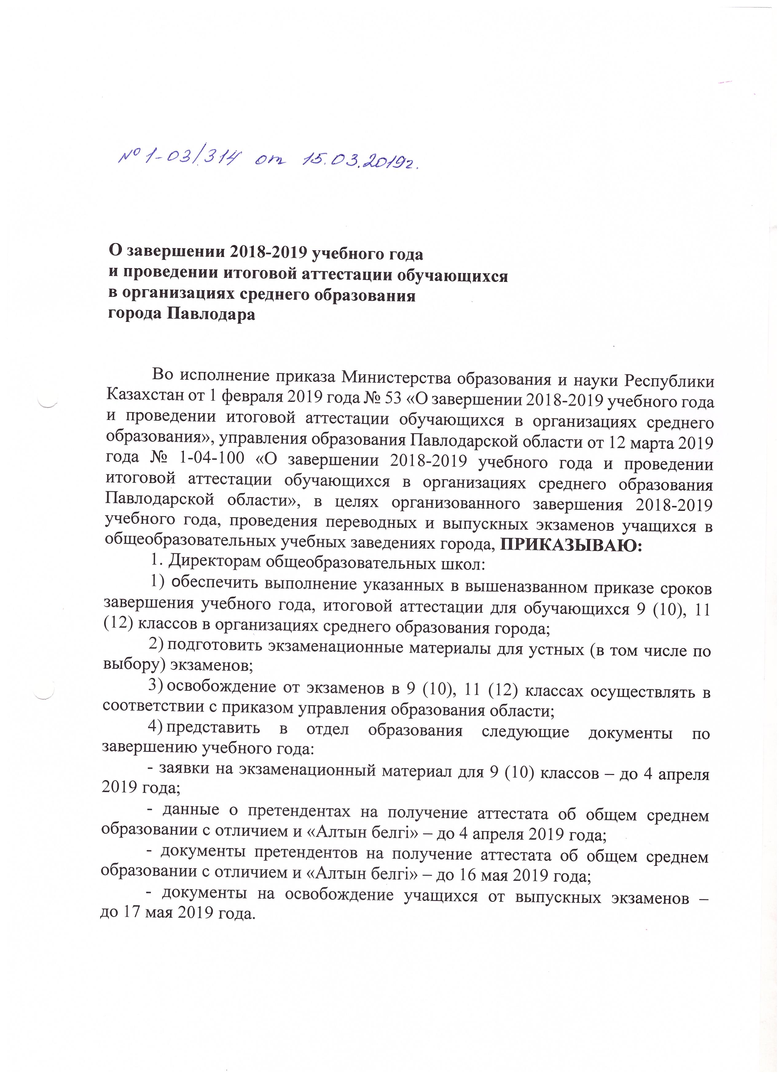 2018 - 2019 оқу жылын аяқтау және орта білім беру ұйымдарының білім алушыларын қорытынды аттестаттаудан өткізу туралы Бұйрық ҚР БҒМ