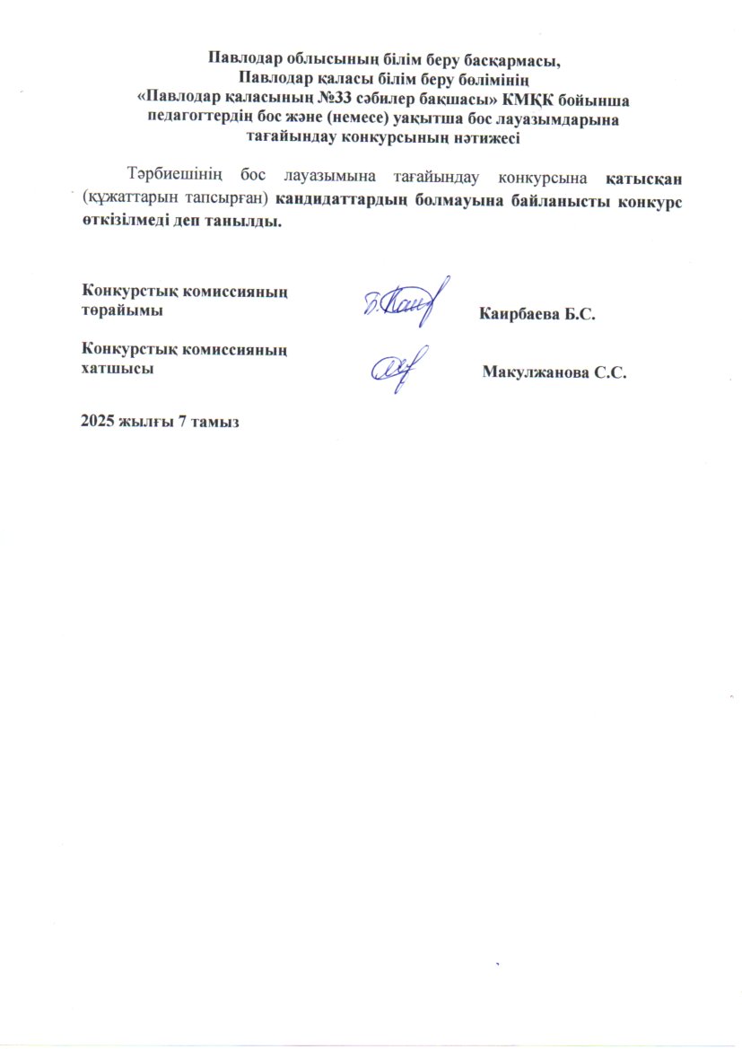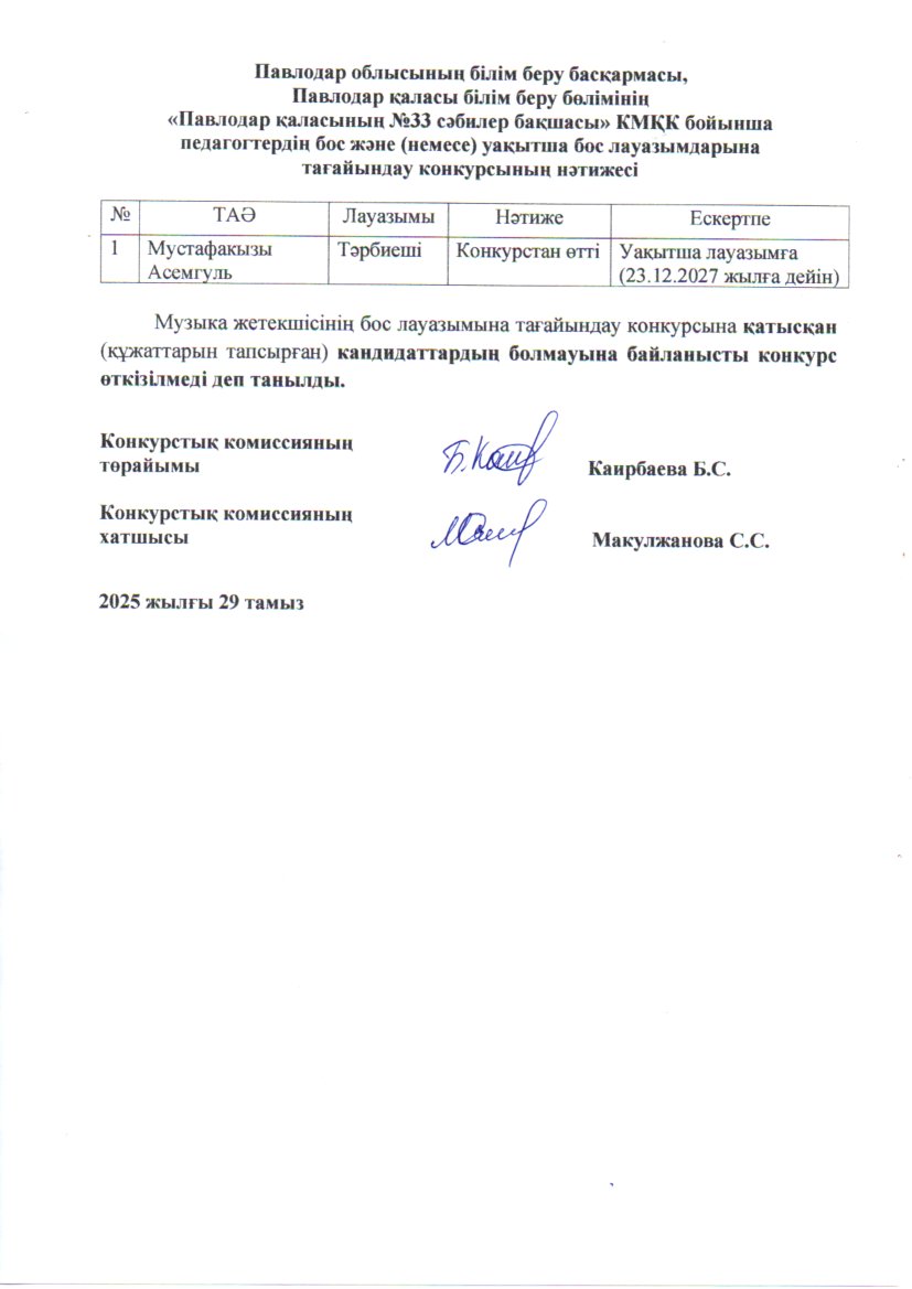 Павлодар облысының білім беру басқармасы, Павлодар қаласы білім беру бөлімінің «Павлодар қаласының №33 сәбилер бақшасы» коммуналдық мемлекеттік қазыналық кәсіпорны тәрбиеші уақытша бос лауазымына орналасуға ашық конкурс нәтижесі | Скачать |