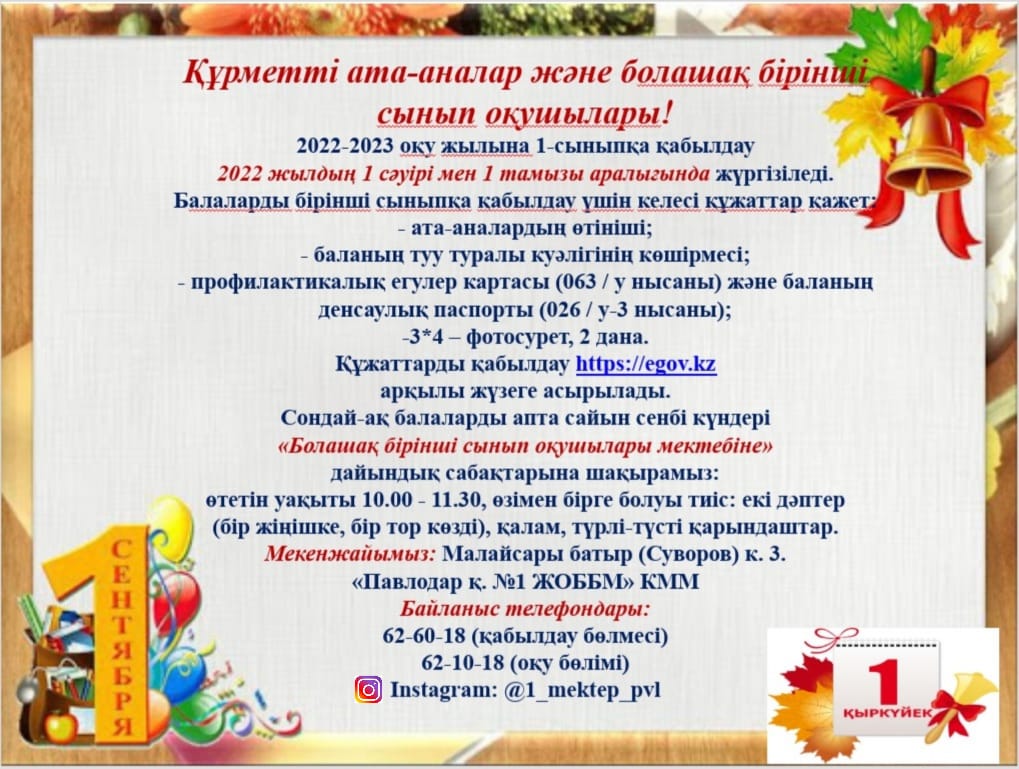 Құрметті ата- аналар және болашақ бірінші сынып оқушылары!