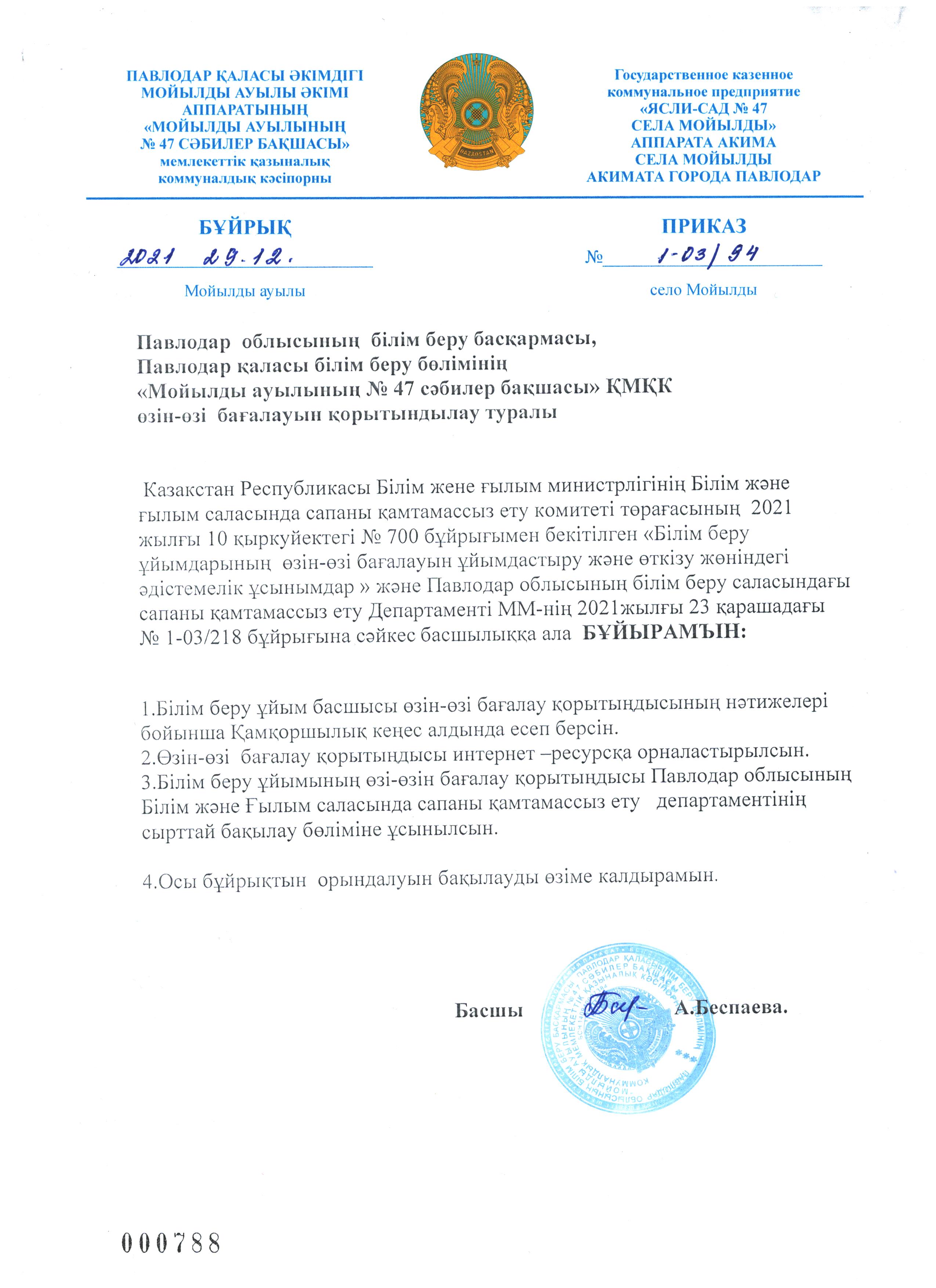 О подведении итогов самооценки КГКП ясли-сад №47 села Мойылды