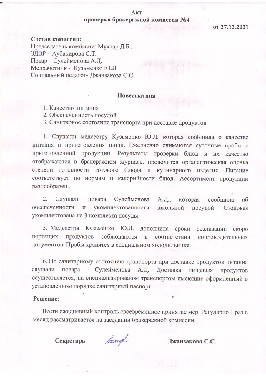 Тамақтану сапасының мониторингі актісі 22.12.2022 ж. №14