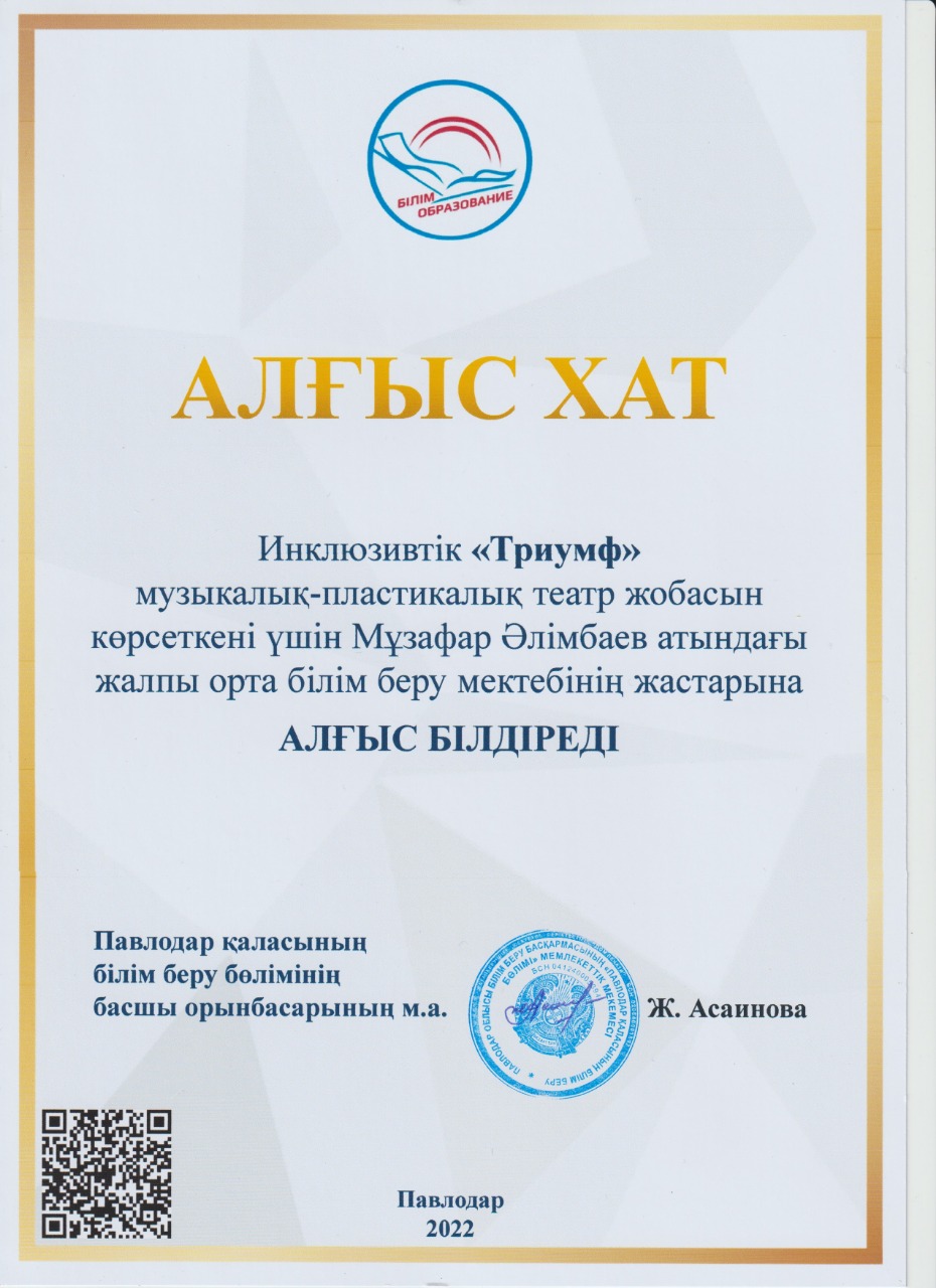 Благодарственное письмо отдела образования города Павлодара | Скачать Смотреть |