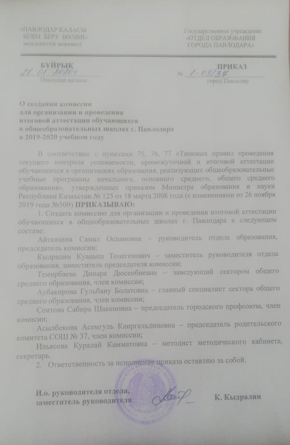 2019-2020 оқу жылында Павлодар қаласының жалпы білім беретін мектептерінде білім алушыларды қорытынды аттестаттауды ұйымдастыру және өткізу үшін комиссия құру туралы бұйрық
