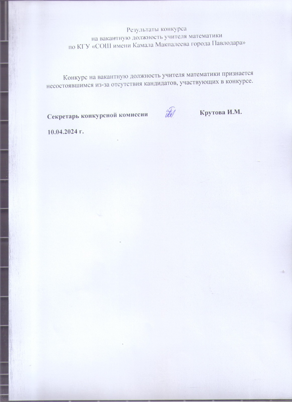 Результаты конкурса на вакантную должность учителя информатики по КГУ “СОШ им.К Макпалеева г. Павлодара» | Скачать |