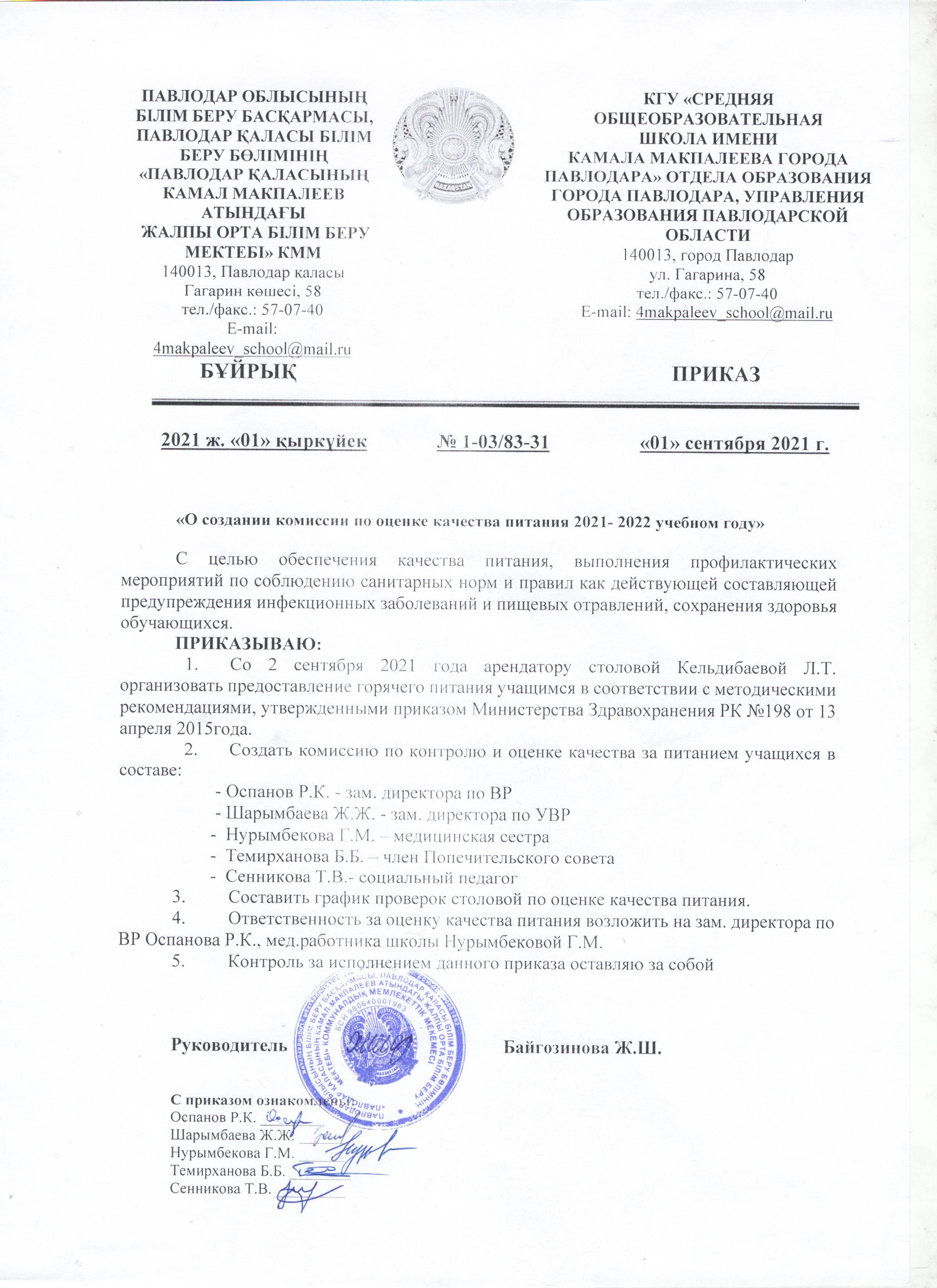 приказ об организации комиссии по мониторингу за качеством питания в столовой на 2021-2022 учебный год. | көшіріп алу |