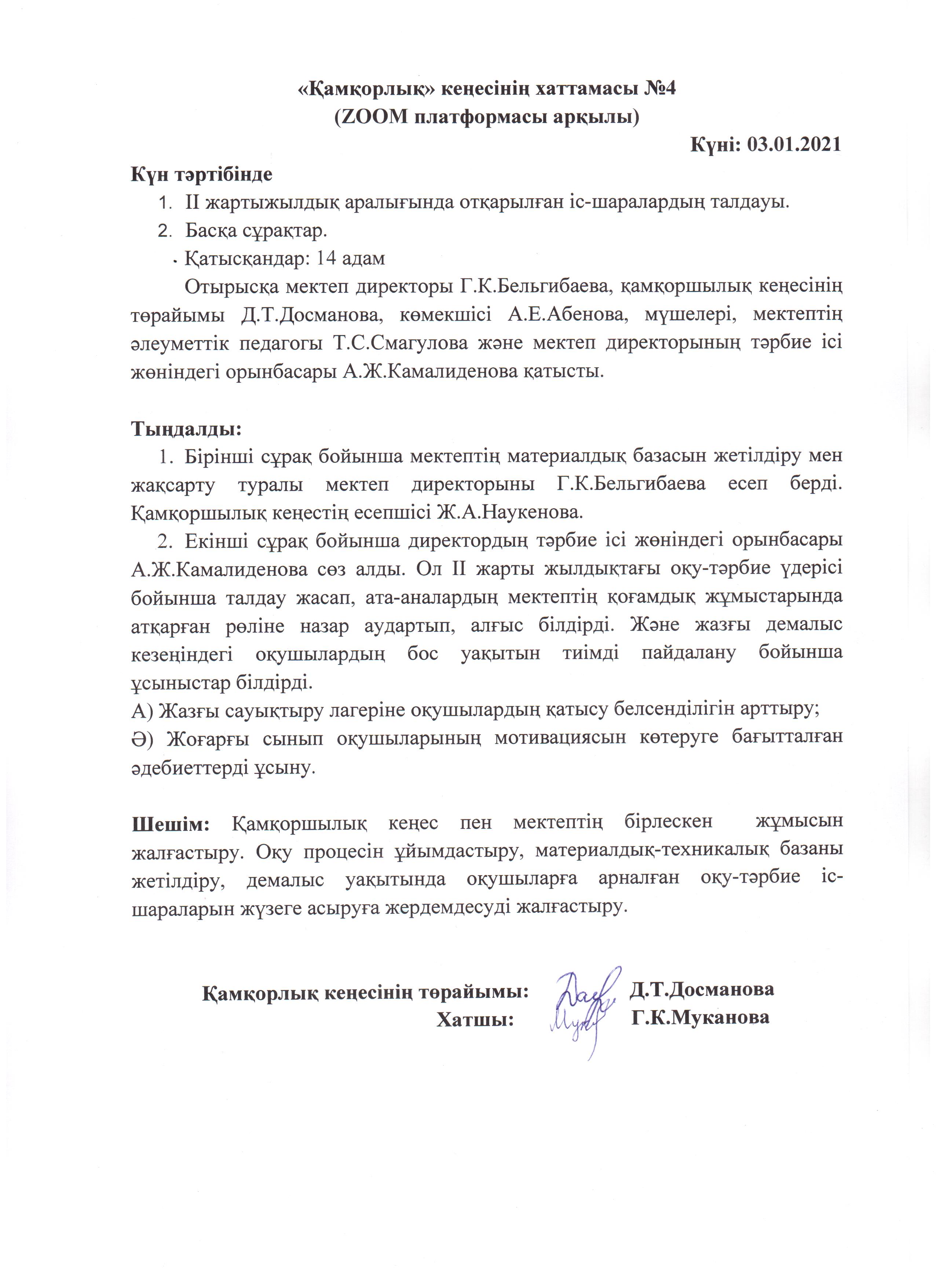 Мектепшілік қамқорлық кеңес отырысының №4 хаттамасы