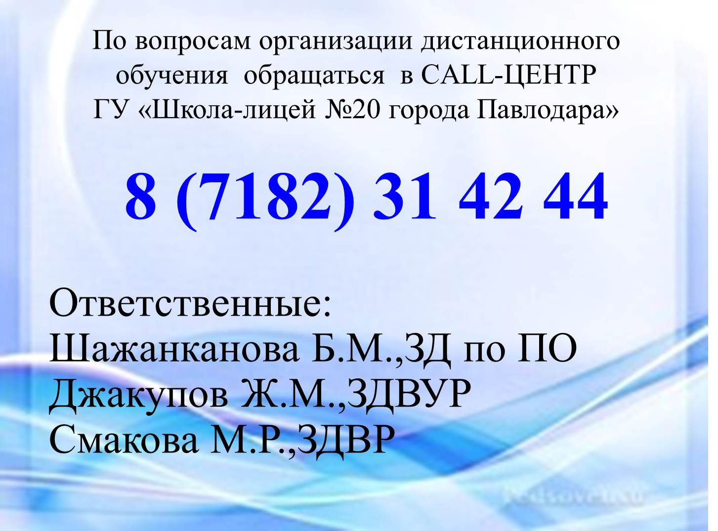 Қашықтықтан оқыту мәселелері бойынша call-орталығының нөмірі | Скачать |