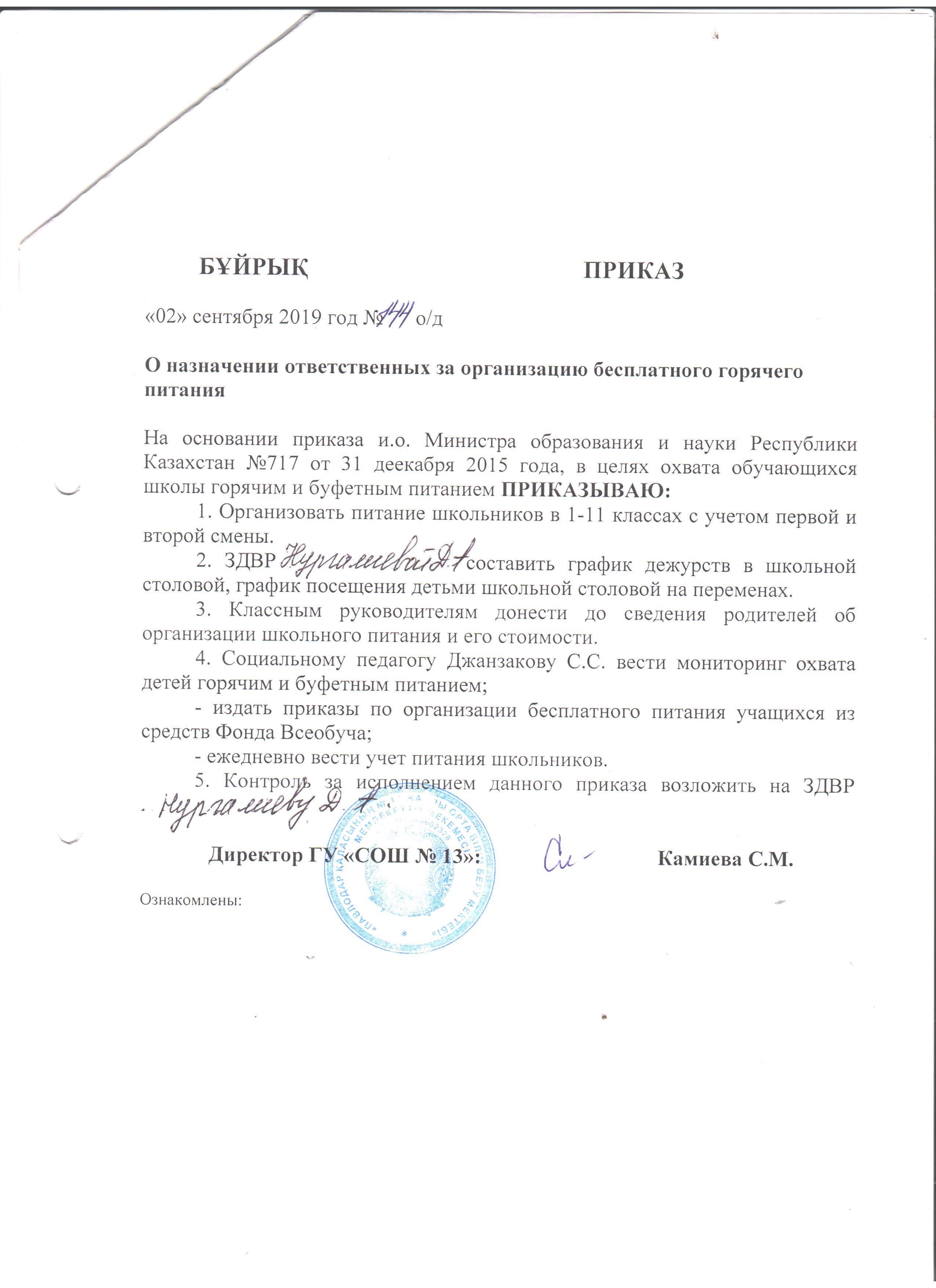 Су ішу тәртібін ұйымдастыру бойынша жауаптыны тағайындау туралы бұйрық | Скачать Смотреть |
