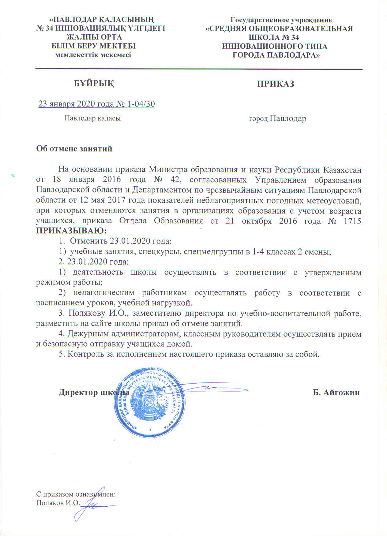2020 жылғы 23 қаңтар күні 2 ауысымның 1-4 сыныптары үшін сабақтарды тоқтату туралы | Скачать |