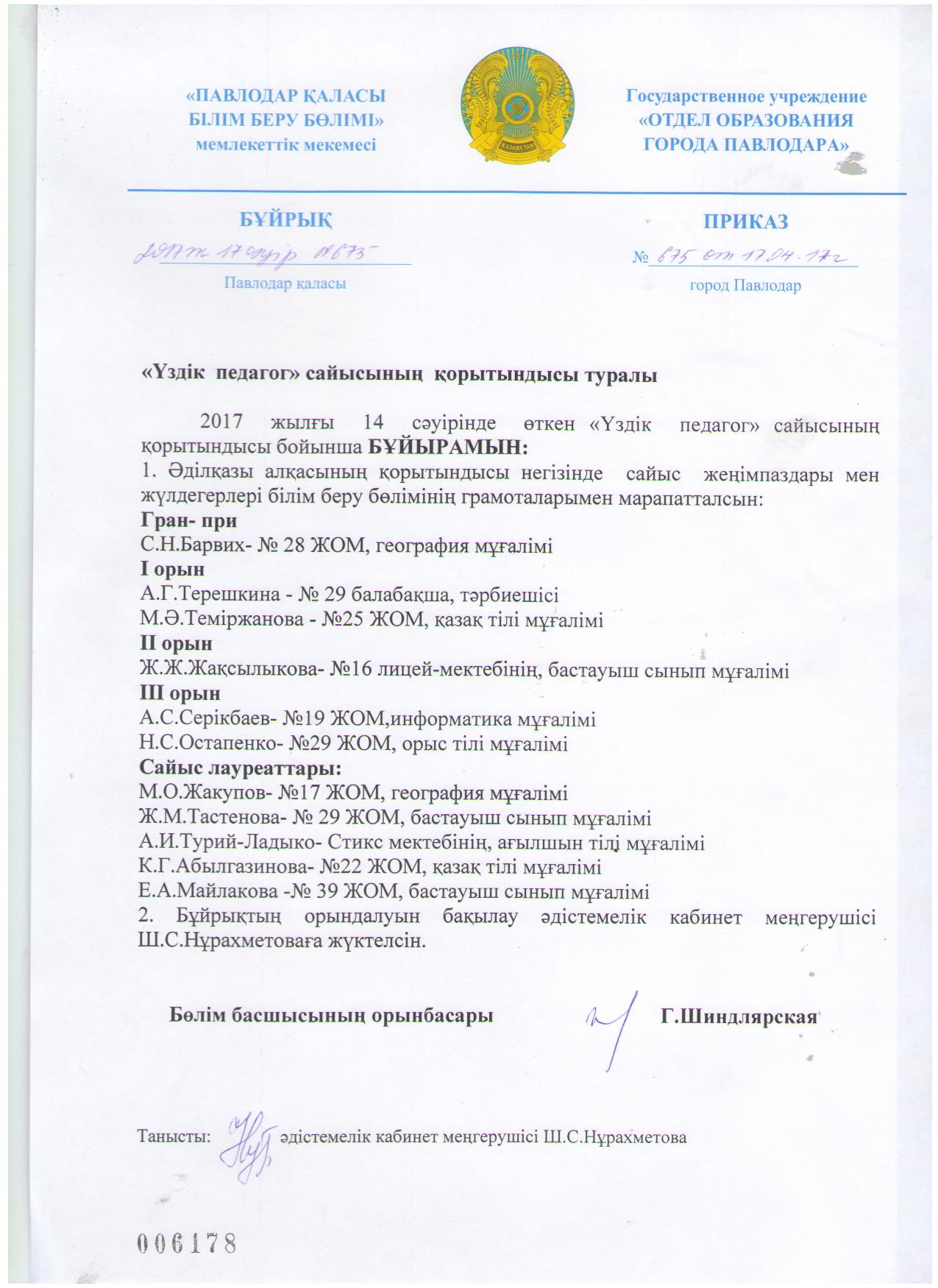 "Үздік педагог" сайысының қорытындысы туралы бұйрық | Скачать |
