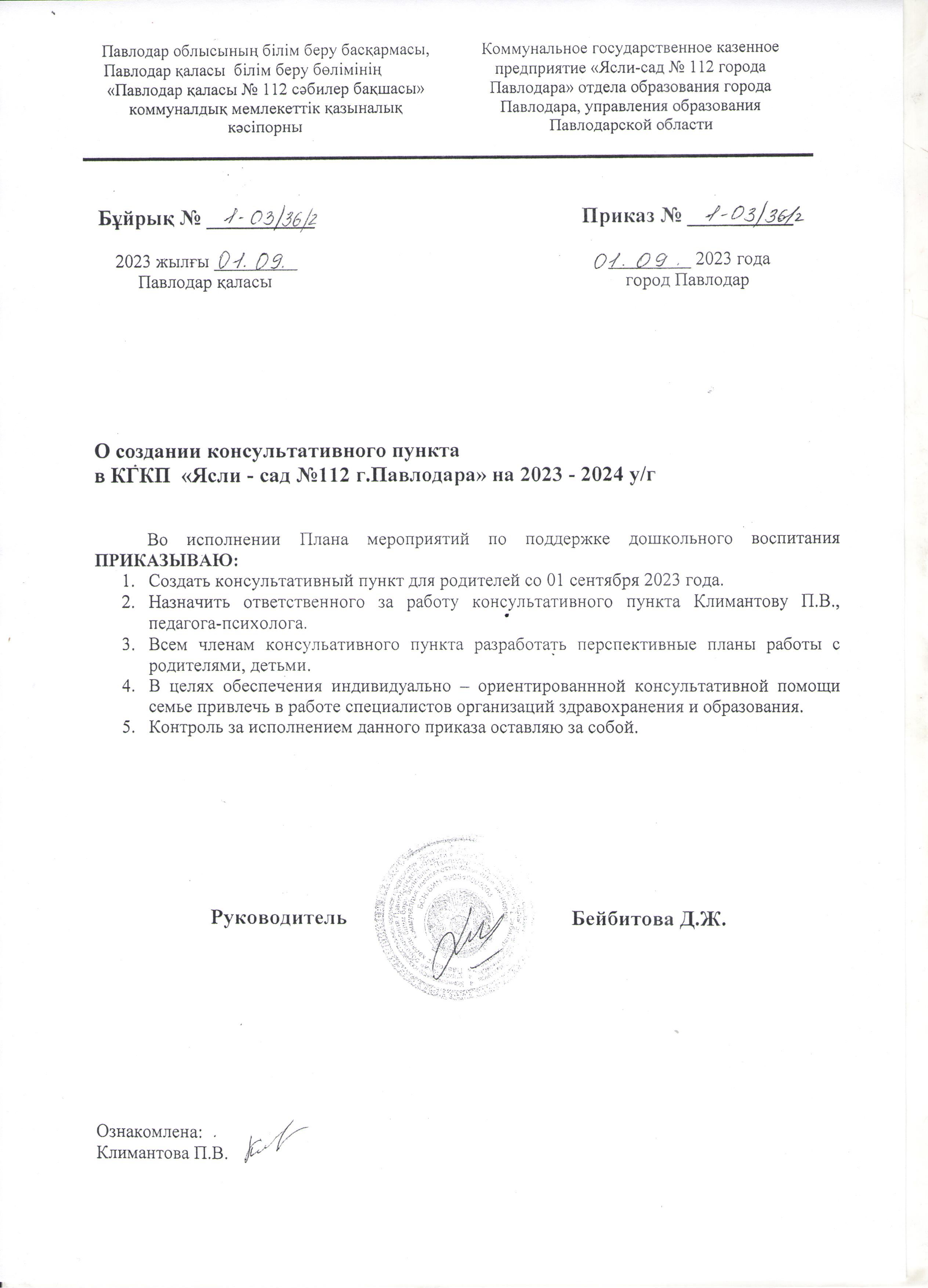 Бұйрық "Ақыл-кеңес беру пункттерін құру туралы" | Скачать |